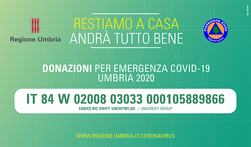 Il conto intestato a Regione Umbria è denominato: “Donazioni per emergenza COVID-19 Umbria 2020”, IBAN : IT 84 W 02008 03033 000105889866