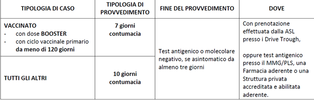 La circolare odierna sostituisce tutte le precedenti disposizioni date per la quarantena e l’isolamento; resta valido che i lungamente positivi asintomatici vengono riammessi in collettività al 21° giorno senza necessità di test.