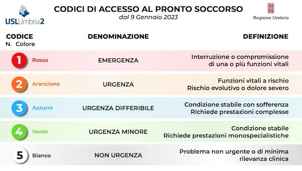Sono queste le caratteristiche del nuovo sistema di triage a cinque codici numerici, in vigore da lunedì 9 gennaio 2023 in tutti i Pronto Soccorso dell’Umbria e che recepisce le linee guida nazionali sul triage intraospedaliero.
