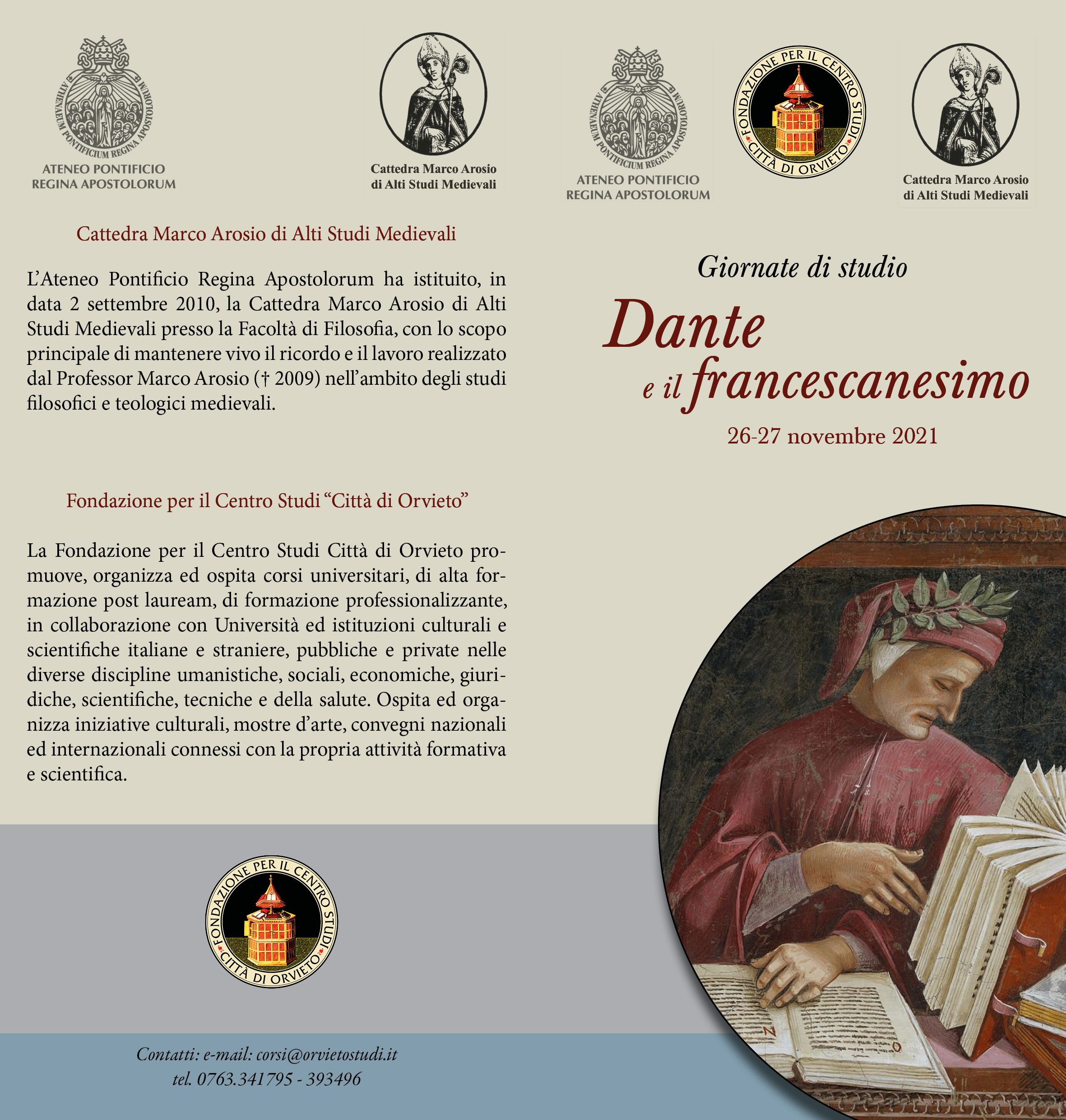 “DANTE E IL FRANCESCANESIMO”. A Palazzo Negroni, Venerdì 26 e sabato 27 novembre due giornate di studio, organizzate dalla Cattedra Marco Arosio di Alti Studi Medievali – Ateneo Pontificio Regina Apostolorum, Roma e dalla Fondazione per il Centro Studi Città di Orvieto