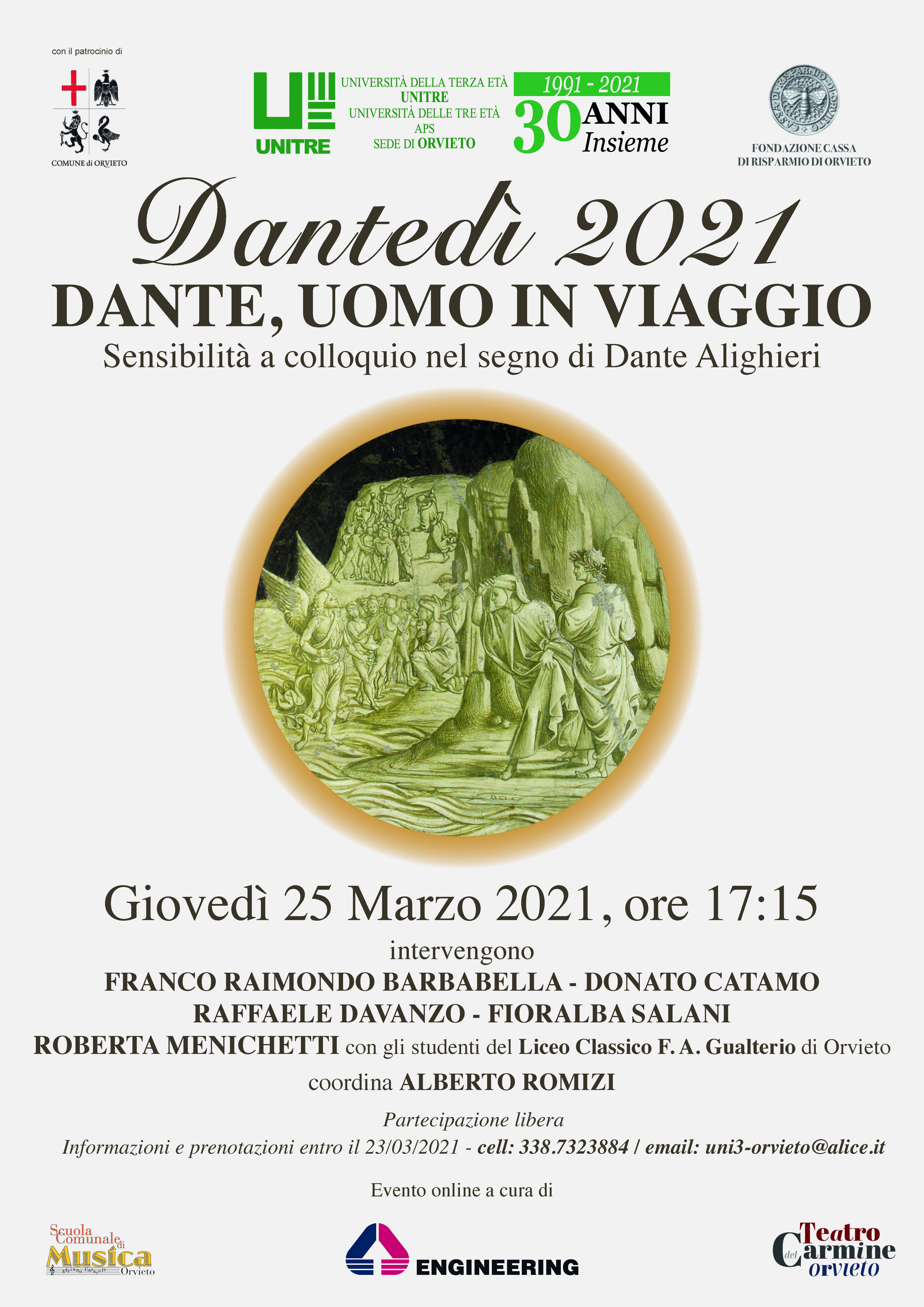 Il 25 Marzo alle ore 17:15, in occasione del Dantedì – la giornata nazionale dedicata a Dante Alighieri per ricordare o riscoprire in Italia e nel mondo il genio del Sommo Poeta – l’Unitre Orvieto propone la video conferenza “Dante, uomo in viaggio” animata da esponenti della cultura locale, aperta on line a chiunque desideri immergersi in un viaggio suggestivo ed entusiasmante.