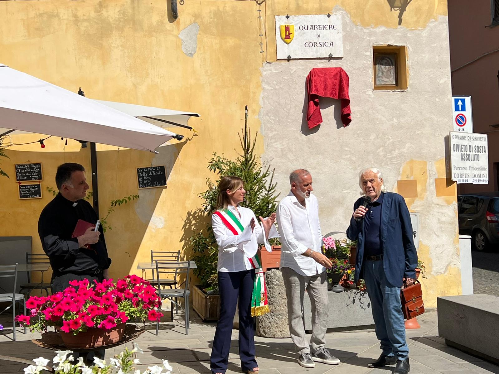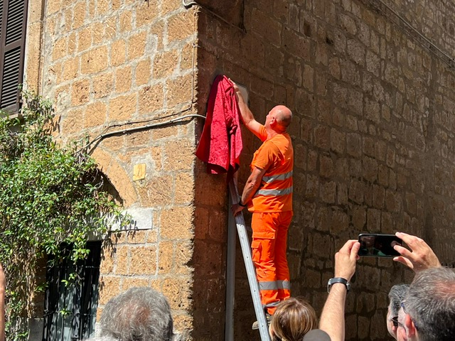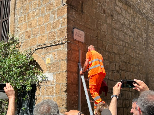 “C’è un filo rosso che unisce insieme il babbo e Lea Pacini – ha aggiunto, particolarmente commosso Marco Conticelli, secondogenito di Marcello nonché Sindaco di Porano – il corteo è nato sul tavolo da disegno, come il disegno degli stendardi e tutto il resto. Questa bottega artigiana ha prodotto oltre a dei capolavori dell’artigianato artistico orvietano, anche tanta socialità. E’ stato luogo di ritrovo di tante persone che condividevano il loro tempo, il loro vissuto e la stessa passione. La bottega ha visto vari collaboratori da Antonio Pacifici a Angelo Bucaioni e Luciano Serranti allievo del babbo. Come dimenticare Franco Menichini che ha creato tutte le calzature del corteo storico o Sergio Riccetti. Sono davvero tanti i personaggi che hanno frequentato la bottega, e ricordarli tutti non è facile! Mi limito a ricordare la loro professione motivata da un amore smisurato verso Orvieto. Già nel 2019 con l’allora sindaco Germani, che oggi è qui e che ringrazio, venne approvata una mozione per l’intitolazione di via Vivaria a Marcello Conticelli, mozione confermata anche dall’attuale Amministrazione. Oggi finalmente tutto questo è diventato realtà e ringrazio il Comune di Orvieto che ha dato attuazione alla volontà della nostra comunità”.