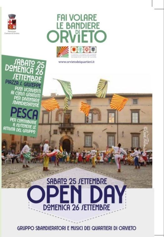 (ON/AF) – ORVIETO – Promosso dal Comitato Cittadino dei Quartieri e patrocinato dal Comune, sabato 25 e domenica 26 settembre 2021 si svolge la 4^ edizione dell’Open Day del Gruppo Sbandieratori e Musici dei Quartieri di Orvieto che, Sabato 25 settembre saranno protagonisti di brevi esibizioni itineranti in Piazza Duomo e Piazza del Popolo.