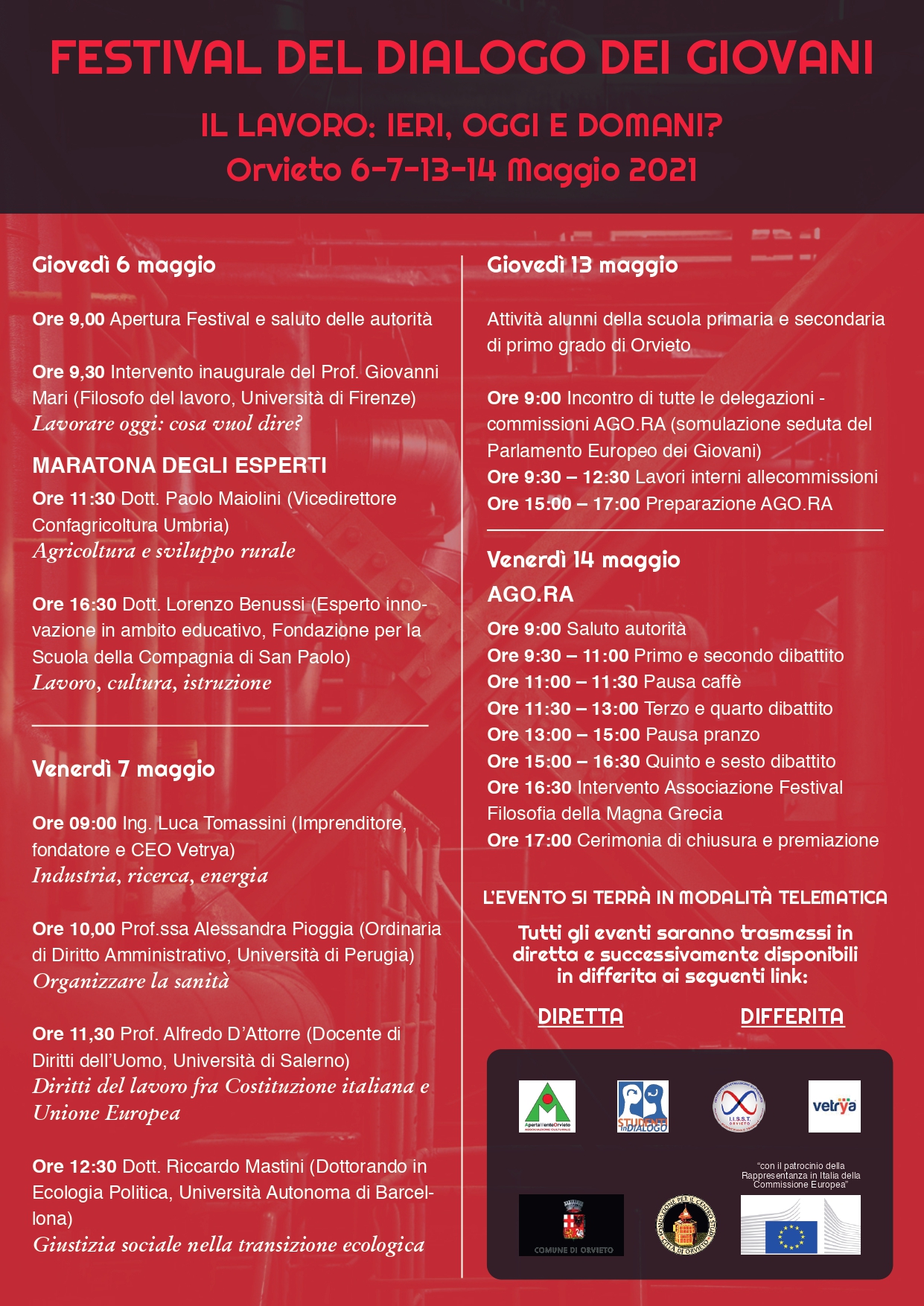 http://bit.ly/festivaldialogo2021. Protagonisti sono 80 studenti del triennio delle scuole superiori di Orvieto, Terni, Fabro e Acquapendente divisi in 6 commissioni che presenteranno le loro specifiche proposte di risoluzione su topic legati alle problematiche relative al mondo del lavoro: sviluppo rurale e sostenibilità ambientale, istruzione e diritti dei lavoratori, riorganizzazione della sanità e nuove tecnologie.