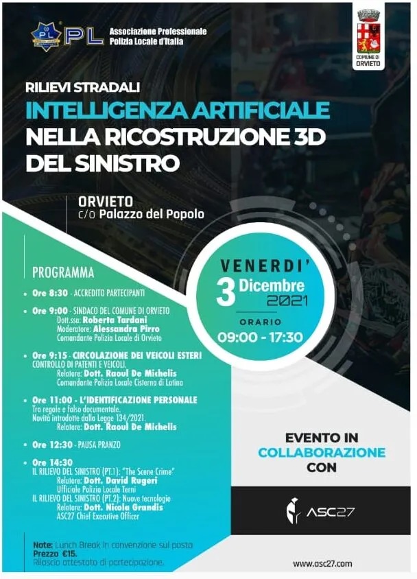 Nella sessione pomeridiana si parlerà, invece, di “Rilievo del sinistro (PT.1): The Scene Crime” a cura di David Rugeri – Ufficio Polizia Locale Terni, e di “Rilievo del sinistro (PT.2): Nuove Tecnologie” con Nicola Grandis – Fondatore e Amministratore Delegato di ASC27.