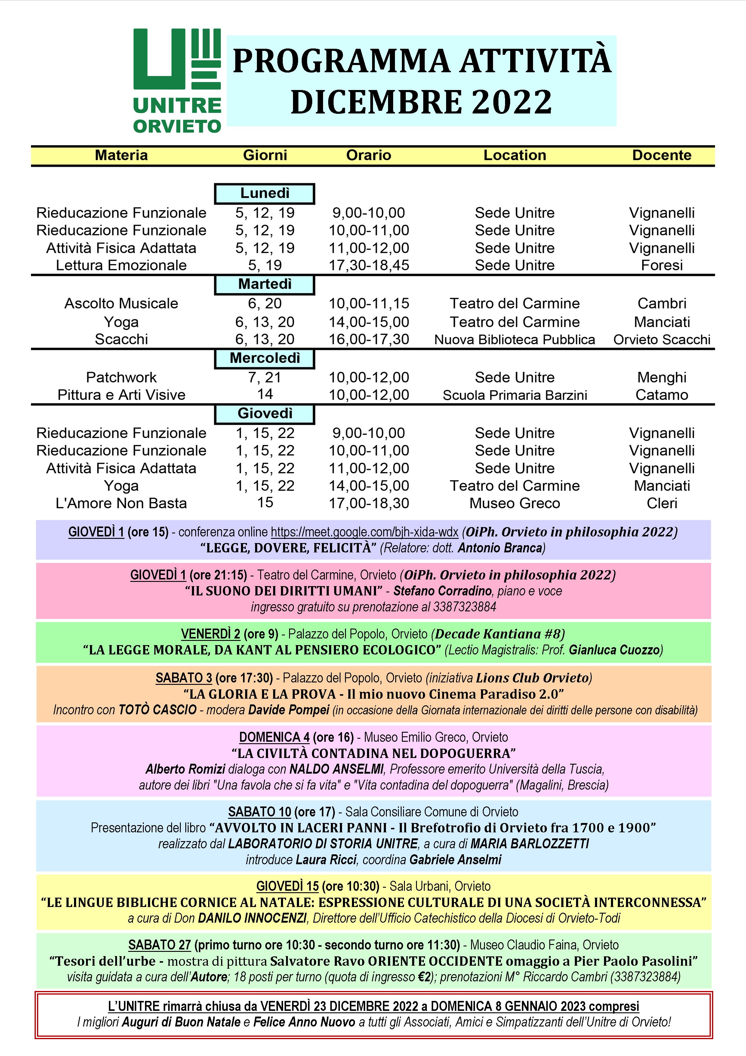 L’Unitre di Orvieto resterà chiusa da Venerdì 23 Dicembre 2022 a Domenica 8 Gennaio 2023 inclusi.
