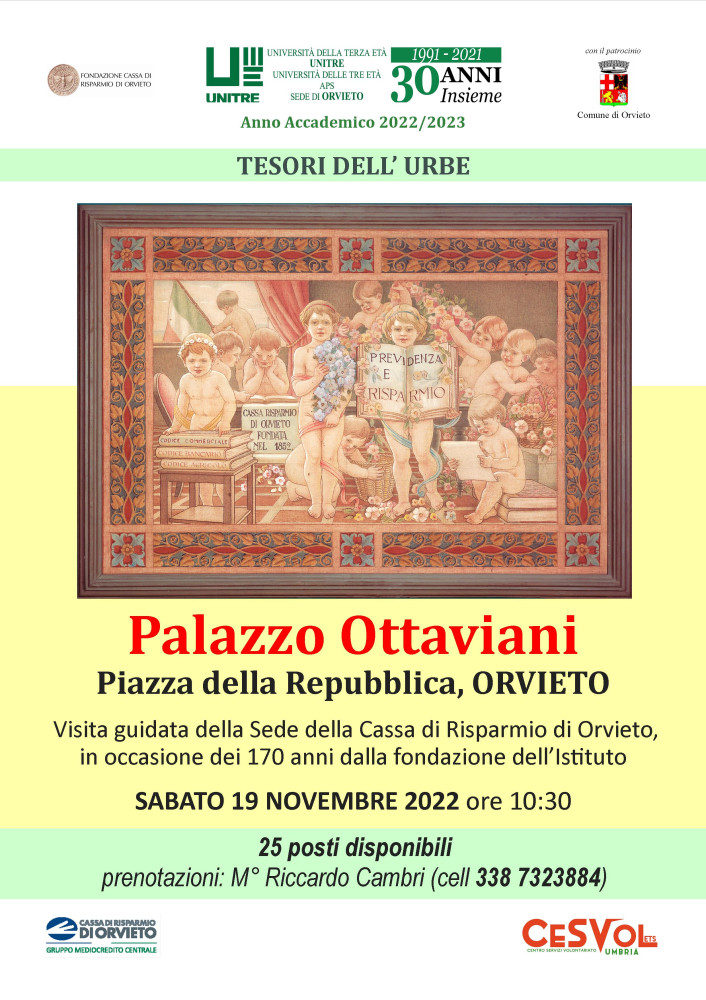 (ON/AF) – ORVIETO – In occasione dei 170 anni della fondazione della Cassa di Risparmio di Orvieto, l’Unitre propone per Sabato prossimo 19 Novembre alle ore 10:30, la visita guidata a Palazzo Ottaviani, sede dello storico istituto di credito cittadino, situato nella centrale piazza della Repubblica.
