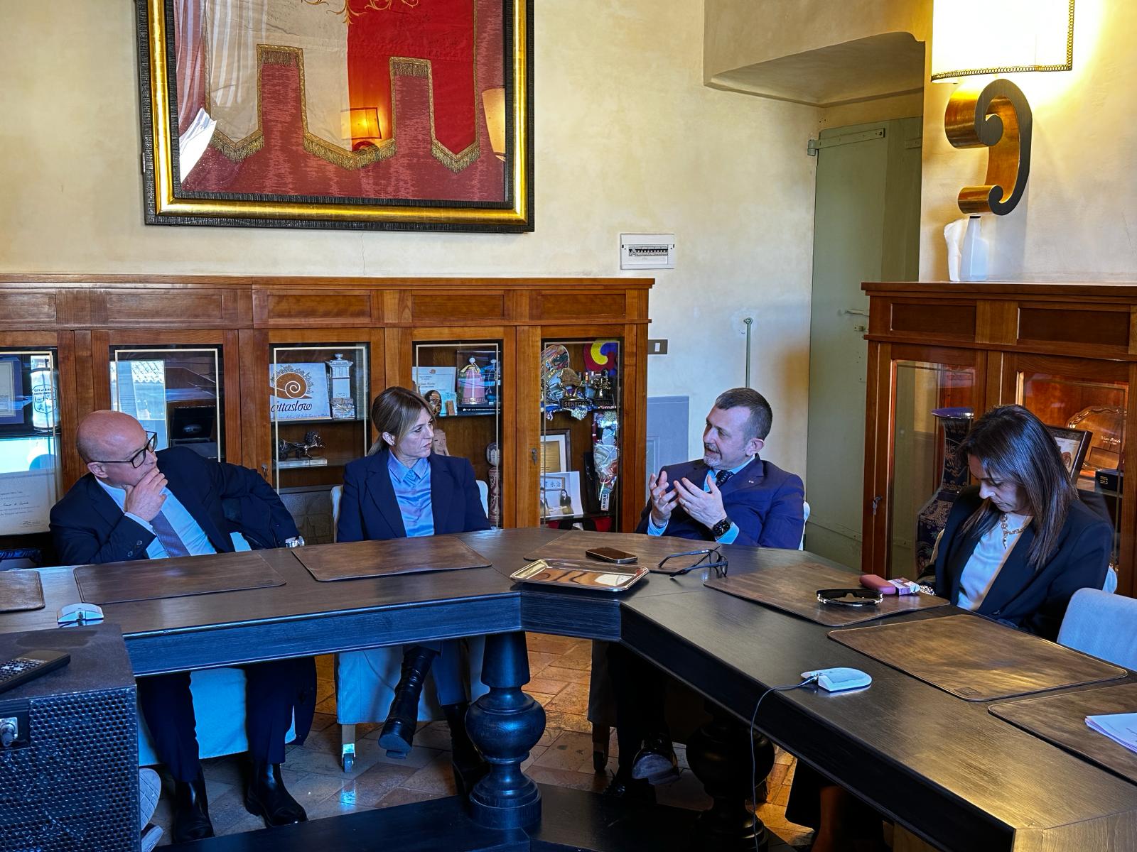(COMUNICAZIONE) ORVIETO – Nella giornata di giovedì 21 marzo il sindaco di Orvieto, Roberta Tardani, e il presidente dell’Associazione Forense di Orvieto, Marcello Caprio, hanno incontrato in Comune il sottosegretario alla Giustizia, Andrea Delmastro Delle Vedove, ospite in mattinata al Teatro Mancinelli di Orvieto delle celebrazioni del 207esimo anniversario della Polizia Penitenziaria organizzate dal Provveditorato Regionale dell’Amministrazione Penitenziaria per la Toscana e Umbria. Presente anche la consigliera regionale e presidente della Terza commissione consiliare dell’Assemblea legislativa umbra, Eleonora Pace.