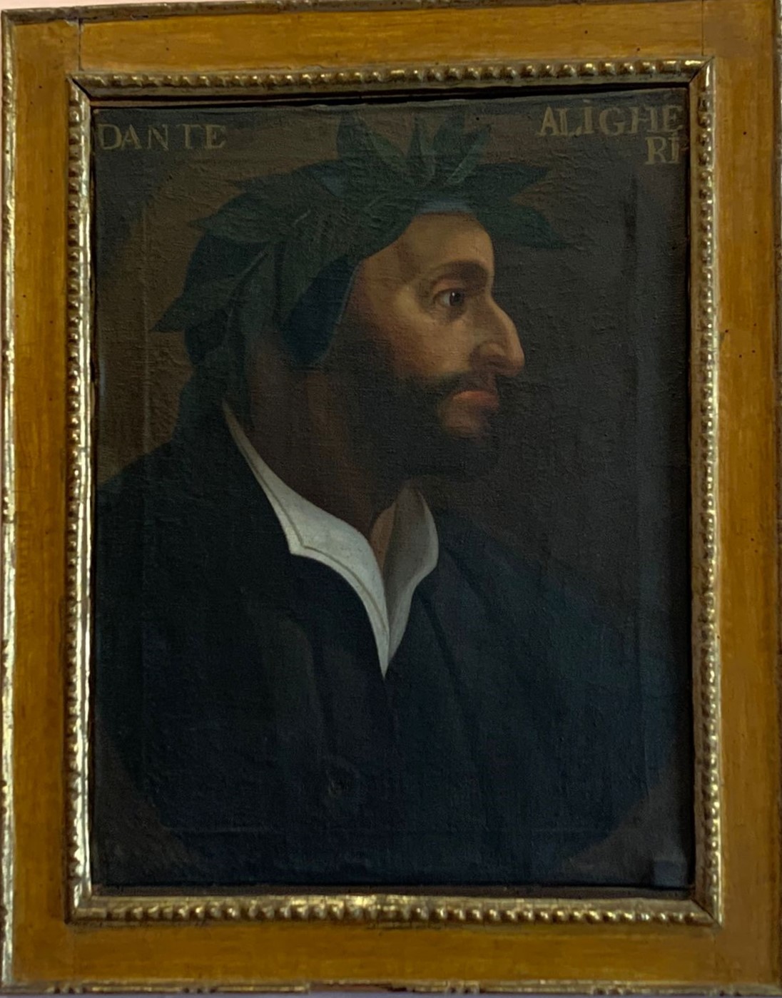 L’opera, di un autore ignoto, probabilmente realizzato alla fine del ‘500 nell’ambiente dei fratelli Zuccari, costituisce la fedele descrizione che del Sommo Poeta fa il suo primo biografo, Giovanni Boccaccio, nel Trattatello in laude di Dante scritto tra il 1351 e il 1355 («Il suo volto fu lungo, e il naso aquilino, e gli occhi anzi grossi che piccioli, le mascelle grandi, e dal labro di sotto era quel di sopra avanzato; e il colore era bruno, e i capelli e la barba spessi, neri e crespi, e sempre nella faccia malinconico e pensoso»).