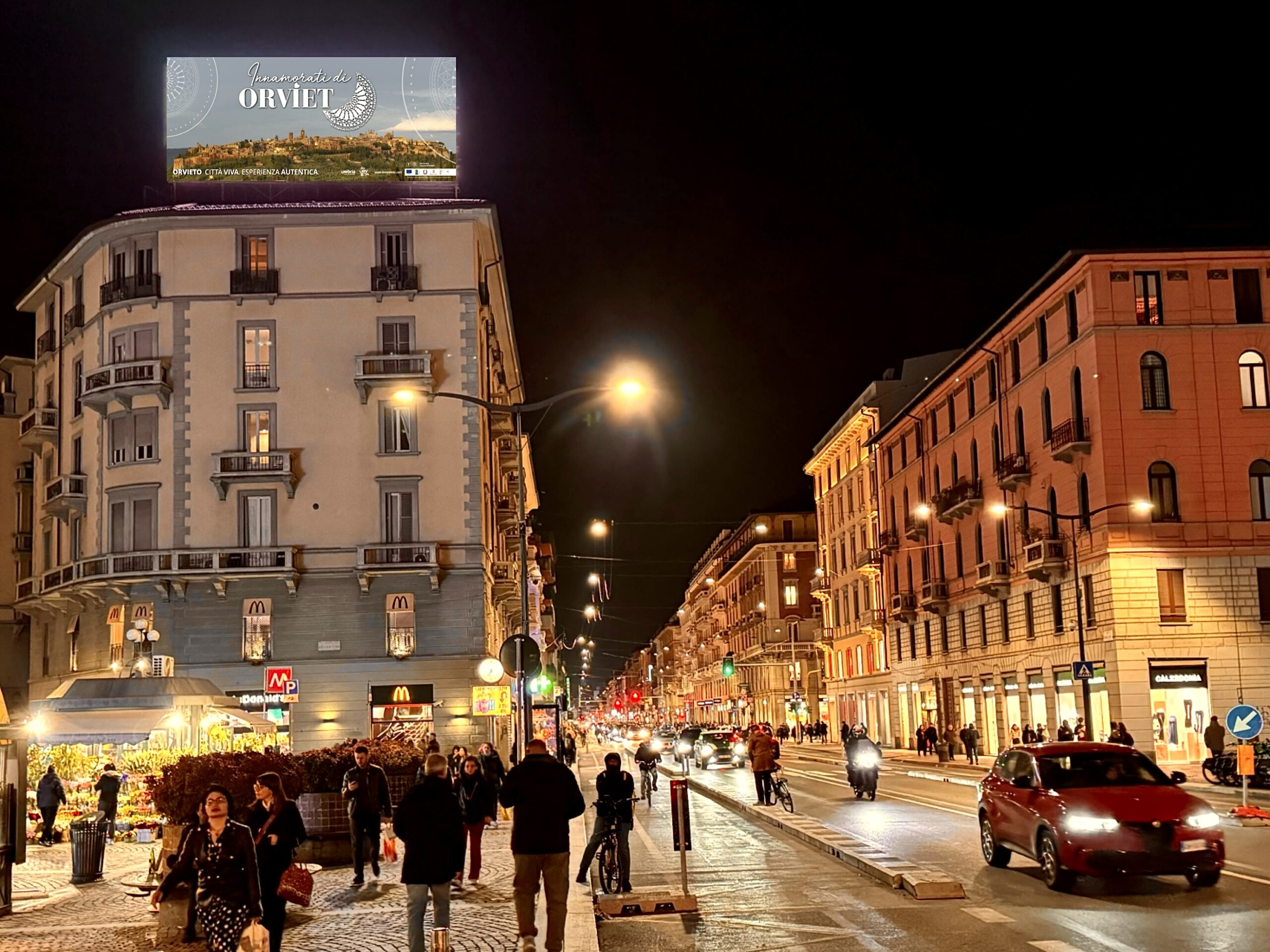Le immagini di Orvieto illuminano Corso Buenos Aires, Corso Garibaldi e il Piccolo Teatro di Brera a Milano, 25 pensiline digitali nel centro storico di Torino e due maxi schermi digitali sulle strade ad alto scorrimento in zona Nomentana e a Piazza Enrico Fermi a Roma. Oltre all’iconica e inconfondibile silhouette della Rupe, nei video scorrono anche i momenti dei grandi eventi cittadini, dal Corteo storico ai concerti in piazza, e quelli conviviali legata al vino che porta il nome della città, l’Orvieto Doc.