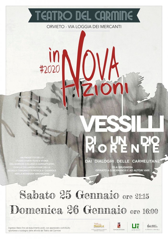 (ON/AF) – ORVIETO – Nell’ambito della Stagione Artistica “inNOVAzioni2020”, promossa dalla Scuola Comunale di Musica “Adriano Casasole”, dal Comune di Orvieto, Unitre e Filarmonica “Luigi Mancinelli”, sabato 25 gennaio alle 21:15 e domenica 26 gennaio alle 16 al Teatro del Carmine – ingresso libero fino ad esaurimento posti (con apprezzato contributo spontaneo a sostegno delle attività del Teatro del Carmine) – Kamina Teatro va in scena con lo spettacolo/studio – o fase di ricerca, per l’originalità, intensità e complessità dei temi e dei caratteri espressivi che suggerisce – intitolato “Vessilli di un Dio morente” ispirato a “Dialoghi delle Carmelitane” di GeorgesBernanos (1888-1948) – dalle cui pagine insieme a quelle de “L’Ultima al Patibolo” di Gertrud von Le Fort (1876-1971) prende il via quest’ultima corale fatica creativa – in cui è scritto che “Quel che Dio mette alla prova non è la forza, ma la debolezza”.