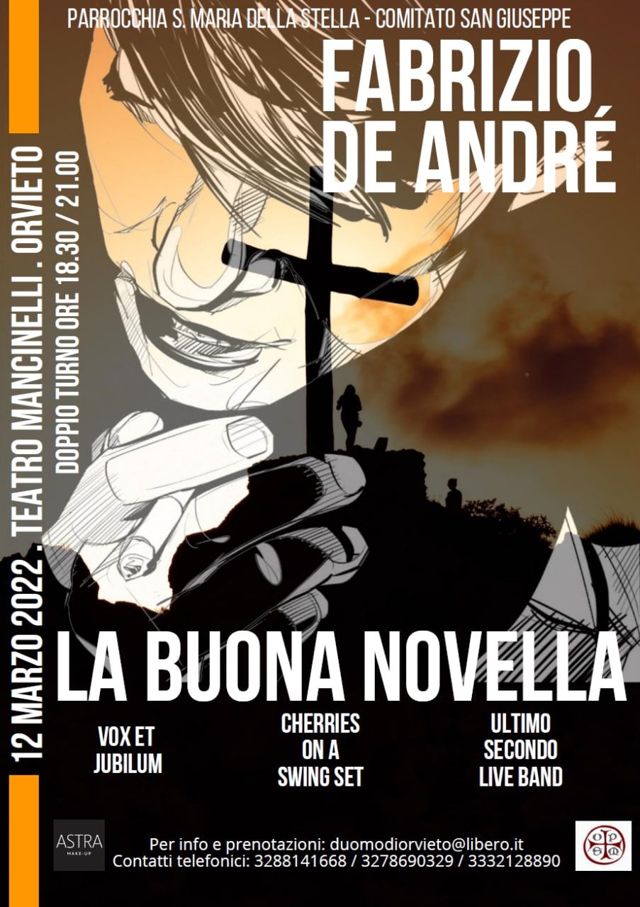 (ON/AF) – ORVIETO – Sabato 12 marzo 2022 al Teatro Mancinelli – doppia rappresentazione alle ore 18:30 e alle 21:00 – si terrà il concerto “La Buona Novella” tratto dall’opera omonima di Fabrizio De Andrè (1970) che vede protagonisti la corale “Vox et jubilum” della Cattedrale, il quintetto vocale “Cherries on a swing set” diretto dal M° Stefano Benini e la band “Ultimo secondo live” con un cameo dell’attore orvietano Davide Simoncini.