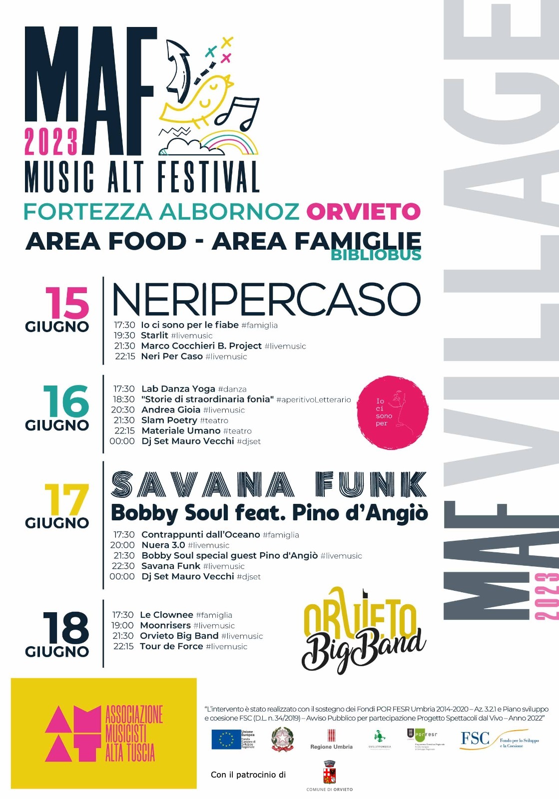 Il MAF 2023 è stato realizzato grazie anche al sostegno dei Fondi derivanti dal Bando Sostegno Spettacoli dal Vivo anno 2022 (POR FESR Umbria 2014 – 2020 – Az. 3.2.1 e dal Piano di Sviluppo e Coesione FSC – Avviso Pubblico per partecipazione Spettacoli dal Vivo).