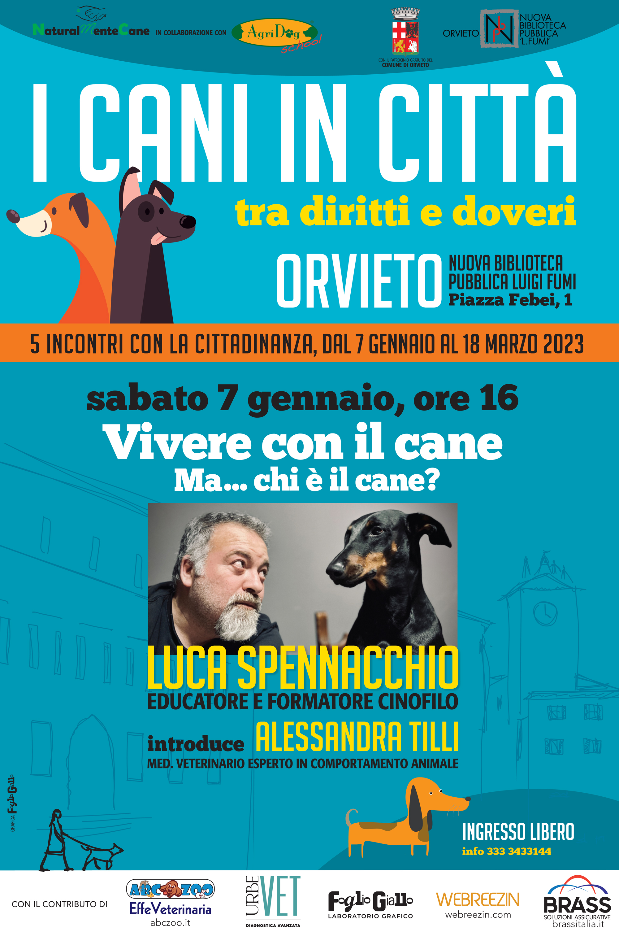 Ad aprire il ciclo di incontri, Sabato 7 gennaio a Orvieto, nell’autorevole contesto della Nuova Biblioteca Pubblica “Luigi Fumi”, sarà Luca Spennacchio sul tema Vivere con il cane. Ma…chi è il cane?. Introduce la Dott.ssa Alessandra Tilli, medico veterinario esperto in comportamento animale, libera professionista associata in un ambulatorio veterinario a Orvieto.