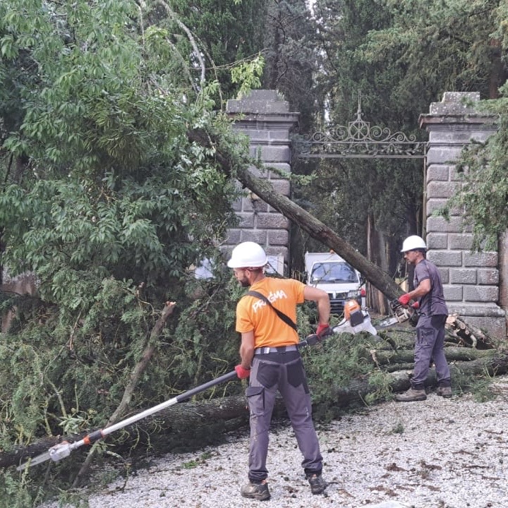 La pioggia e il forte vento hanno causato il cedimento di piante e rami, divelte le coperture di alcuni edifici loculi. Allagati i locali tecnici del parcheggio di Foro Boario