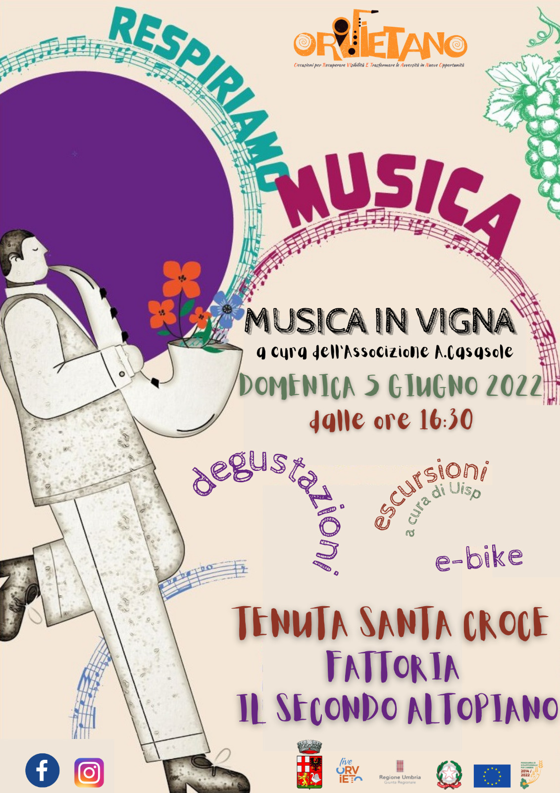 (ON/AF) – ORVIETO – Domenica 5 giugno a partire dalle ore 16:30 presso la Tenuta Santa Croce poco distante dal Castello di San Quirico è in programma “Musica in Vigna” primo dei tre appuntamenti di “Respiriamo Musica” previsti dal progetto O.R.VI.ET.A.N.O / Occasioni per recuperare visibilità e trasformare le avversità in nuove opportunità, finanziato nell’ambito del Programma di Sviluppo Rurale 2014 – 2022 – Intervento 16.7.1