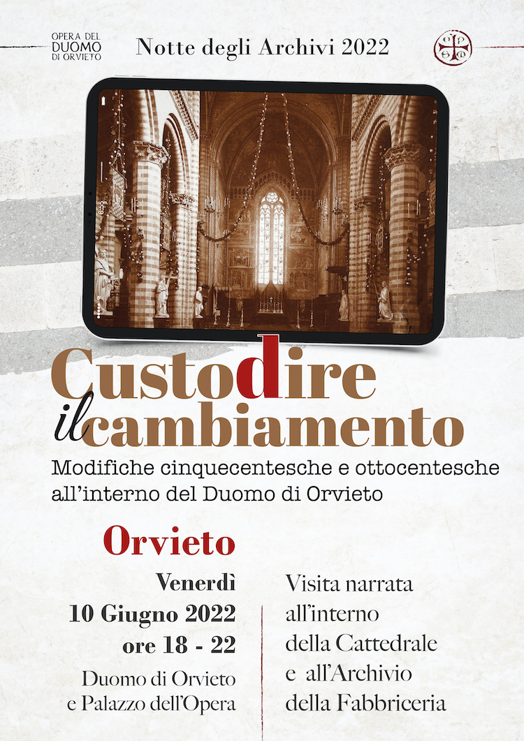 (ON/AF) – ORVIETO – In occasione della Notte degli Archivi 2022, l’evento nazionale che dal 9 al 12 giugno apre le porte degli archivi di musei, gallerie, accademie, università e aziende, l’archivio dell’Opera del Duomo di Orvieto propone – Venerdì 10 Giugno, a partire dalle ore 18 – l’appuntamento culturale dal titolo “Custodire il cambiamento – Modifiche cinquecentesche e ottocentesche all’interno del Duomo di Orvieto”, visita narrata all’interno della Cattedrale alla scoperta del valore del patrimonio storico e documentale custodito presso l’Archivio della Fabbriceria orvietana e delle modifiche più evidenti che nel corso dei secoli sono state apportate alla celebre Cattedrale di Orvieto.