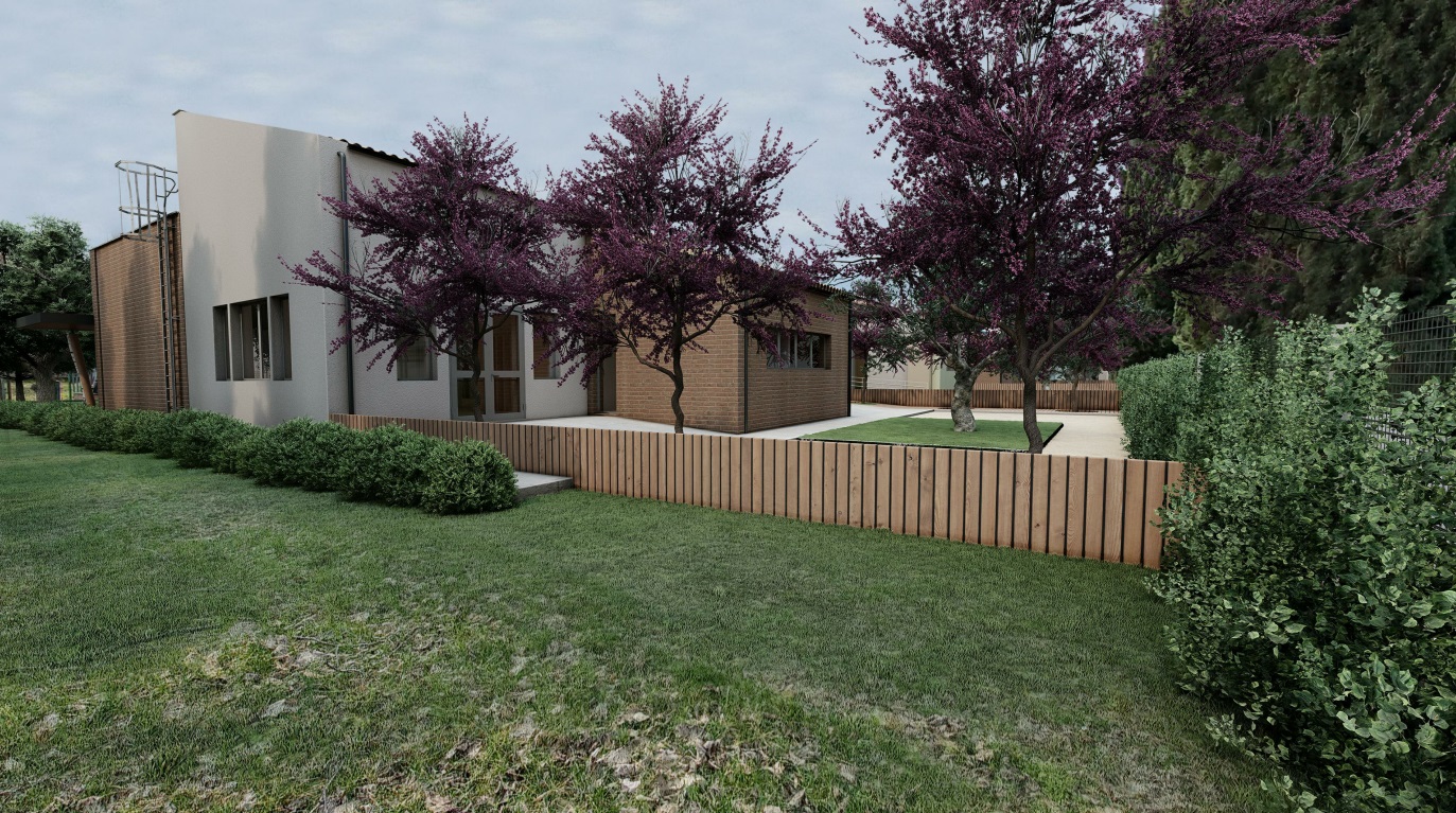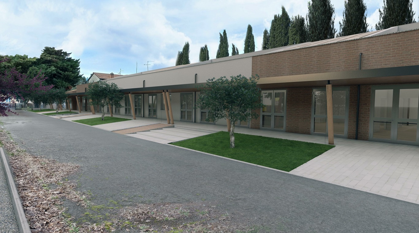 L’accesso alla scuola avverrà sia dal parcheggio esistente ubicato sul lato nord della struttura sia direttamente da via Tevere, dove verrà realizzato un nuovo accesso carrabile per i mezzi di soccorso e come ingresso diretto per le persone con disabilità motorie. Un impianto fotovoltaico garantirà la completa autosufficienza energetica alla scuola.