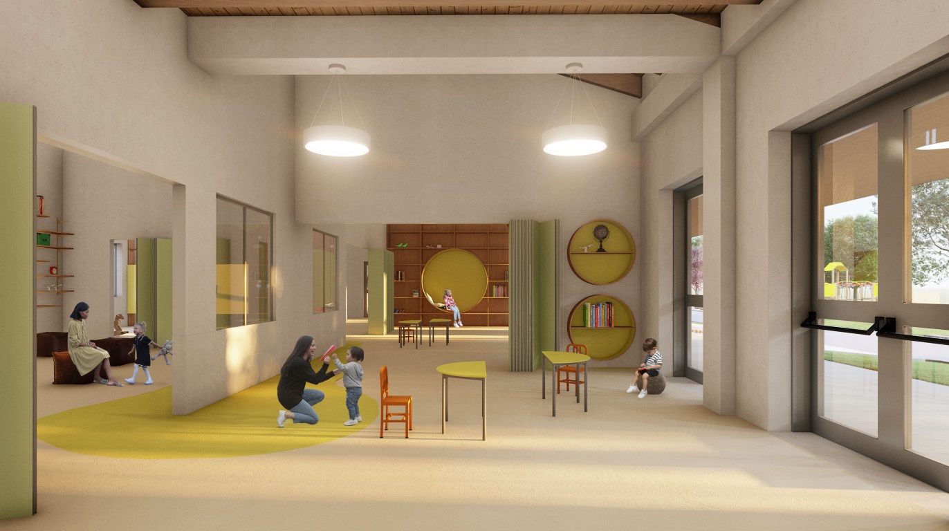 Grazie alla soluzione individuata di pareti mobili e semimobili, verrà rivisitato lo schema tradizionale dell’aula concepita come spazio chiuso e il corridoio come semplice collegamento interno. Le aule potranno così diventare luoghi aperti e interconnessi all’occorrenza con le altre aree comuni. I collegamenti interni non saranno più considerati come semplici passaggi, ma diventano essi stessi spazi funzionali “learning landscape” destinati sia alla distribuzione interna sia allo svolgimento di attività. In questo senso la permeabilità visiva tra gli spazi sarà importante per facilitare l’interazione tra le classi e gli spazi distributivi dando quindi la possibilità di trasformarsi in un unico spazio didattico. Scaffali e arredi vari permetteranno inoltre al bambino di vivere gli ambienti come luoghi domestici dove imparare ad acquisire competenze legate all’autonomia.