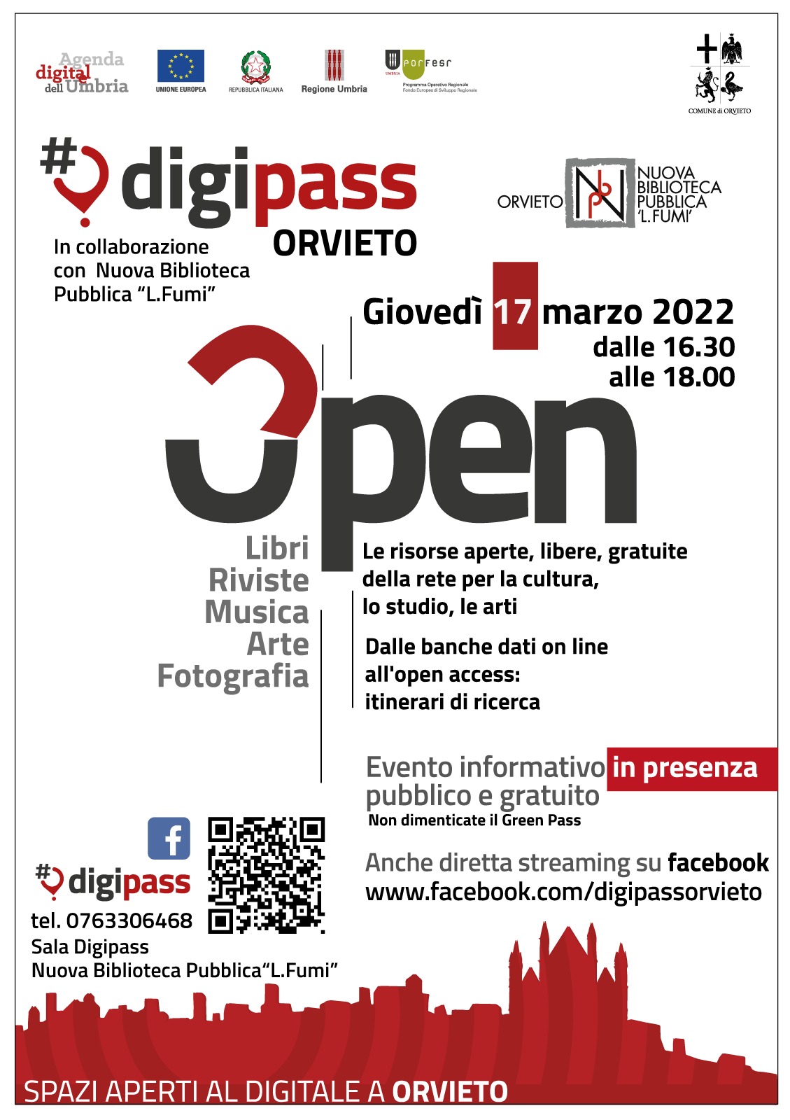 Giovedì 17 marzo alle ore 16 presso il DigiPass di Orvieto si terrà un incontro formativo pubblico e gratuito, in presenza, dal titolo: “Open” ovvero un confronto tra esperti del DigiPass e della Nuova Biblioteca Pubblica “Luigi Fumi” sul mondo del sapere a portata di un click.