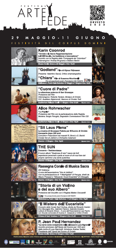 “Cuore di Padre. La silenziosa potenza di San Giuseppe”, invece, è il titolo della pellicola che sarà in visione giovedì 1° giugno alle 21.00 all’Auditorium “Gioacchino Messina” di Palazzo Coelli, sede della Fondazione Cassa di Risparmio di Orvieto. Il film sarà introdotto dai saluti del sindaco di Orvieto, Roberta Tardani. Moderatori dell’incontro Guido Barlozzetti (giornalista/conduttore) e Alessandra Cannistrà (storica dell’arte). Nella stessa sede, sabato 3 giugno alle 18.30, sempre ad ingresso libero, si proietta il cortometraggio già candidato all’Oscar “Le Pupille” di Alice Rohrwacher, con l’attesa partecipazione della regista attualmente impegnata a Cannes con il nuovo film “La Chimera”.. Modererà Sergio Perugini, segretario della Commissione Film della Conferenza Episcopale Italiana. “Sit Laus Plena, la musica di Giuseppe Pedota per il Duomo di Orvieto riscoperta dopo 200 anni” è il concerto in Cattedrale, in programma per domenica 4 giugno alle 19.00, realizzato in collaborazione con il Lions Club Orvieto dalla Corale Vox et Jubilum e dall’Orchestra Calamani. Trascrizioni dei Maestri Riccardo Bonci e Stefano Benini. Sempre in Duomo, lunedì 5 giugno alle 21.00, sarà la volta del concerto-testimonianza dei THE SUN che presenteranno il nuovo album “Qualcosa di vero”, nato da forti esperienze personali e in grado di parlare al cuore di chi vuole fare del proprio cammino una storia autentica.