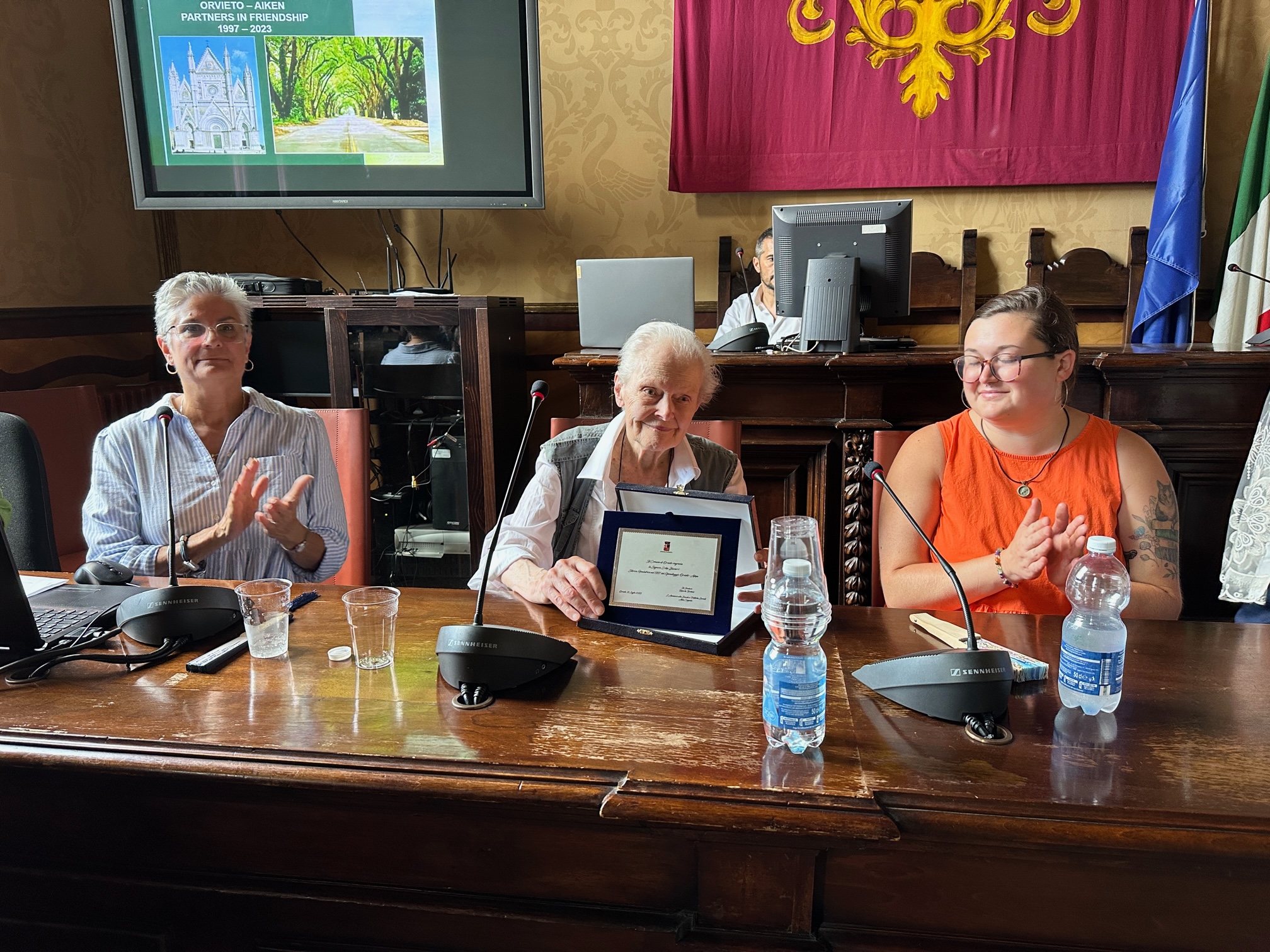 Ideatrice e promotrice del patto di amicizia con Aiken nel 1997 è stata la scrittrice Erika Bizzarri, presente alla cerimonia, alla quale l’assessore Coppola e il sindaco di Orvieto, Roberta Tardani, hanno consegnato una targa di ringraziamento. Alle professoresse Miriam Picciolini e Francesca Spataro, che in questi anni hanno organizzato gli scambi, è stato quindi affidato il compito di raccontare le tappe salienti dei 25 anni di gemellaggio tra Orvieto e Aiken: la firma nel ’97, il primo viaggio di una delegazione di Aiken a Orvieto nel 1999, la prima visita della delegazione di Orvieto ad Aiken l’anno successivo e i viaggi alla scoperta delle bellezze dell’Italia e degli Stati Uniti che i partecipanti hanno potuto effettuare durante le rispettive visite. Ma è stata l’occasione anche per ricordare il pittore e scultore orvietano Livio Orazio Valentini che è stata una figura centrale del patto di amicizia tra le due città nel segno dell’arte. Alcune delle sue opere sono ancora in esposizione nella mostra permanente all’Università di Aiken e a lui la cittadina statunitense ha conferito la cittadinanza onoraria.