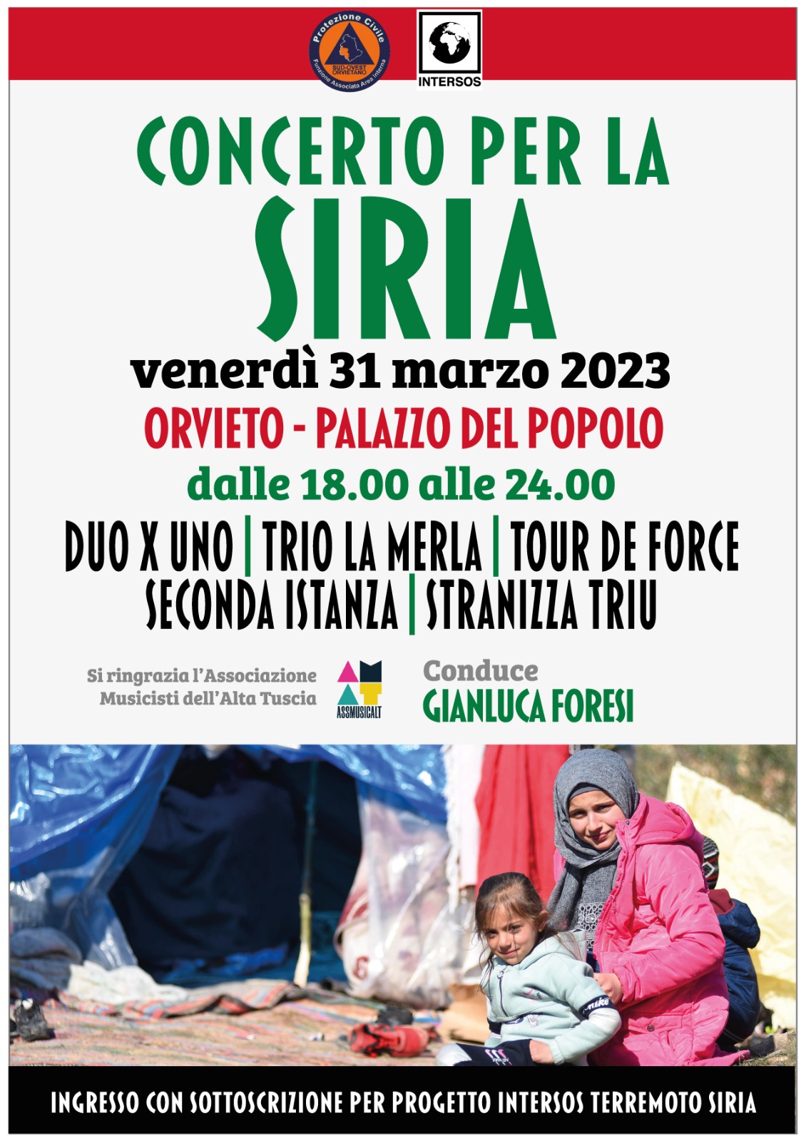 (COMUNICAZIONE) ORVIETO – Da Orvieto un aiuto concreto alle popolazioni terremotate della Siria. Venerdì 31 marzo, dalle 18 alle 24 a Palazzo del Popolo, si terrà il “Concerto per la Siria” organizzato dalla Funzione associata della Protezione civile Sud Ovest Orvietano con la collaborazione dell’Associazione MusicAlt.