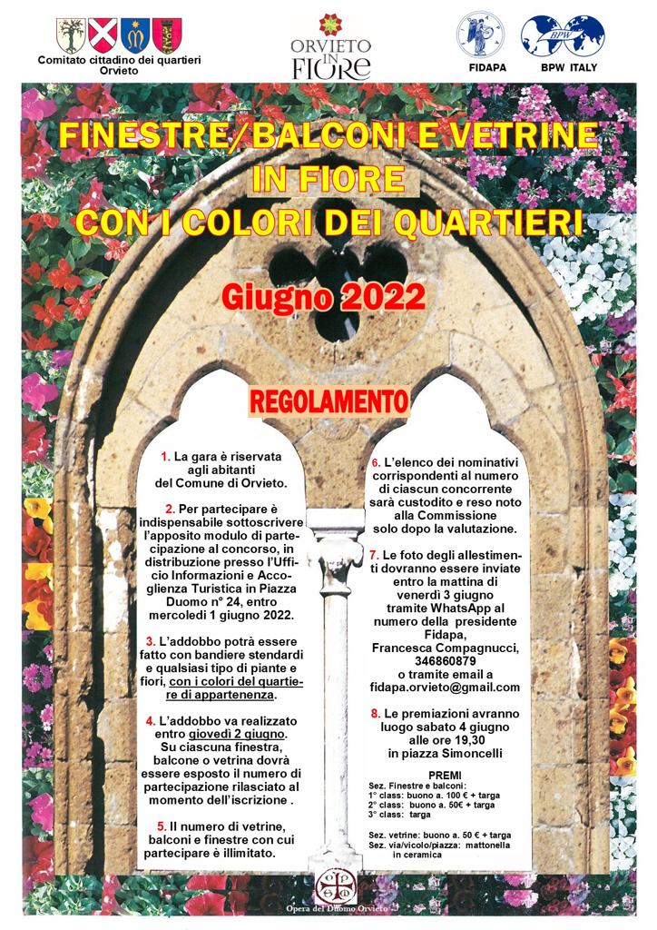 (ON/AF) – ORVIETO – Dopo due anni di sospensione a causa del Covid, acquista un nuovo sapore l’edizione 2022 del CONCORSO “FINESTRE VETRINE E BALCONI IN FIORE CON I COLORI DEI QUARTIERI” strettamente collegata alla manifestazione “Orvieto in Fiore” (di prossima presentazione).