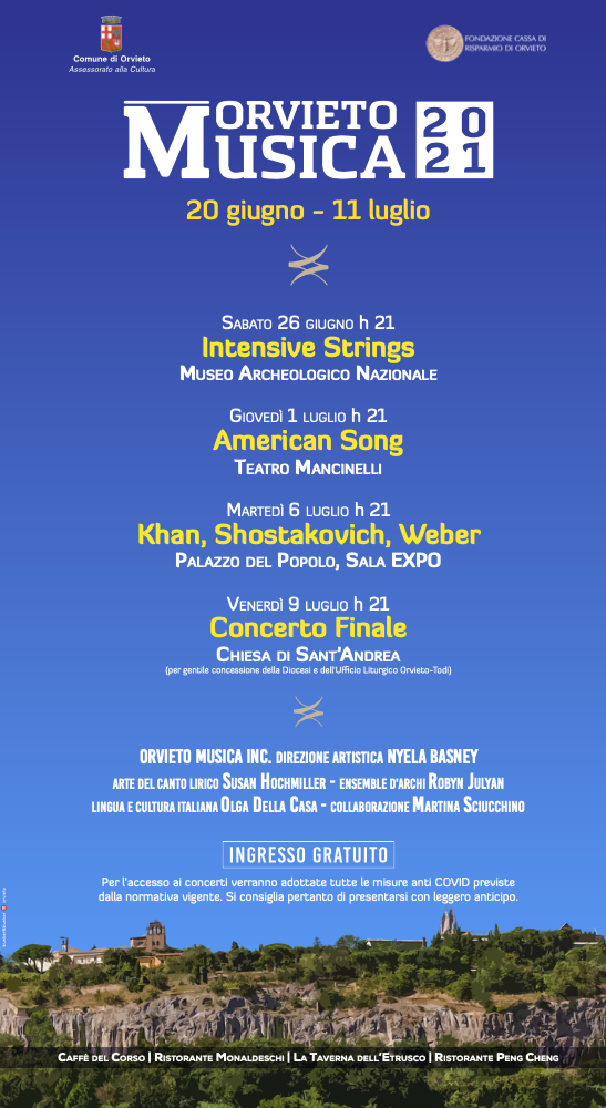 (ON/AF) – ORVIETO – Si rinnova ad Orvieto l’appuntamento con ORVIETO MUSICA, Festival internazionale di musica da camera, diretto dalla musicista americana Nyela Basney e giunto alla 28^ edizione. A causa delle restrizioni dovute alla pandemia, quest’anno invece non si svolgerà il TrumpetFest.
