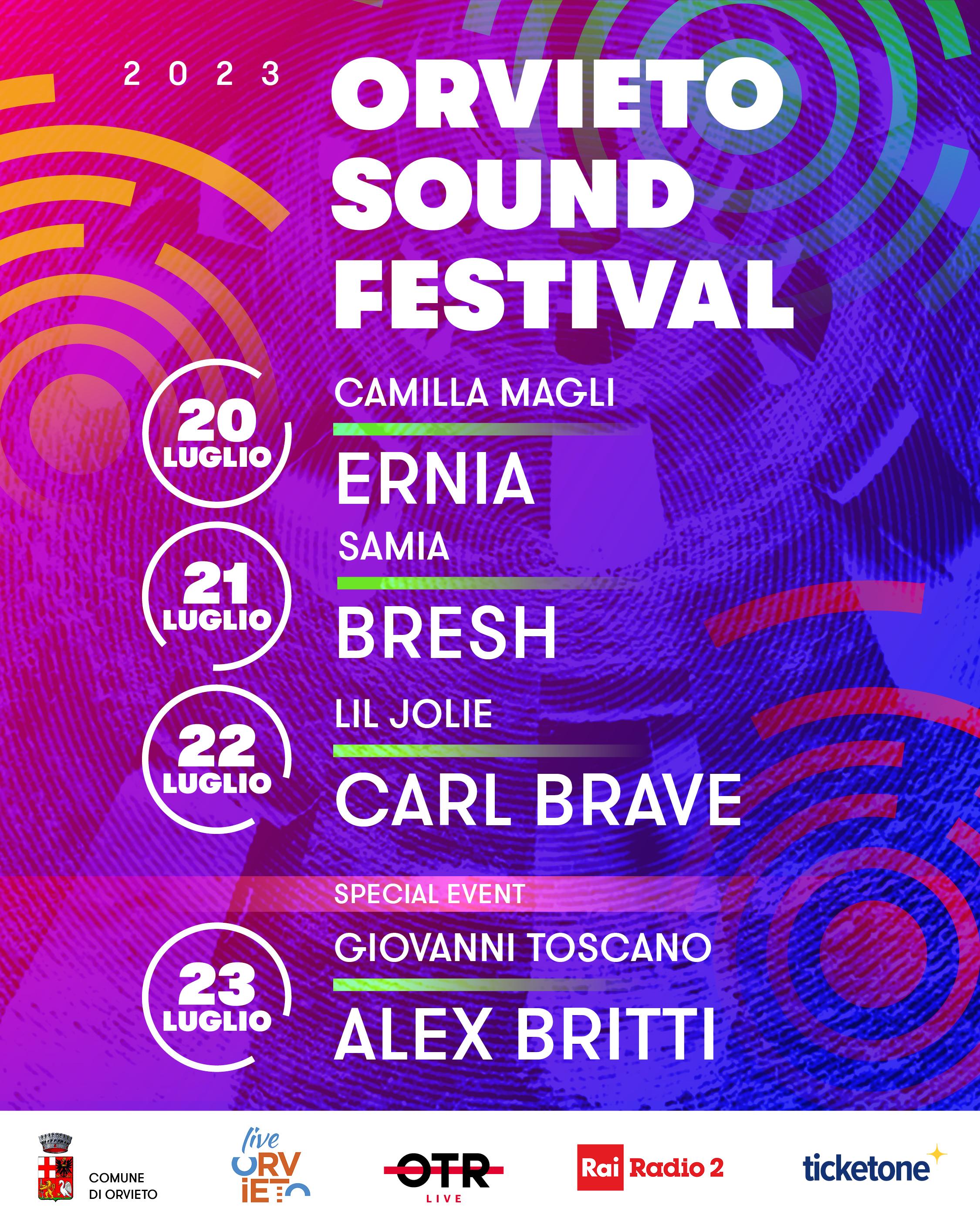 Si completa così il programma di Orvieto Sound Festival che quest’anno prevede quattro giornate di concerti, dal 20 al 23 luglio, confermando la formula che mette insieme i big della musica italiana del momento e giovani emergenti. I protagonisti saranno Ernia (20 luglio), Bresh (21 luglio), Carl Brave (22 luglio) e Alex Britti (23 luglio). A loro saranno affiancati Camilla Magli, Samia, Lil Jolie e Giovanni Toscano.