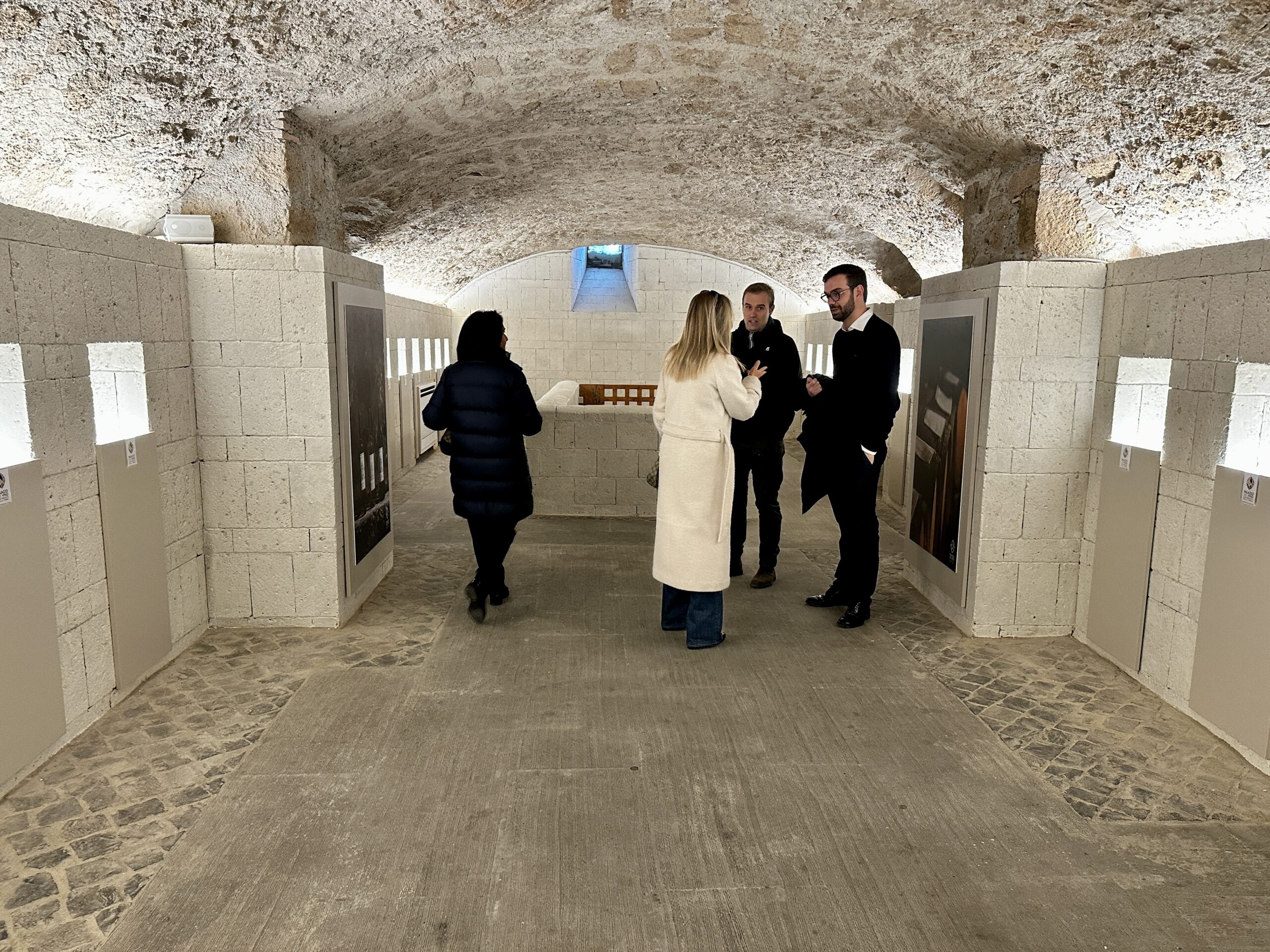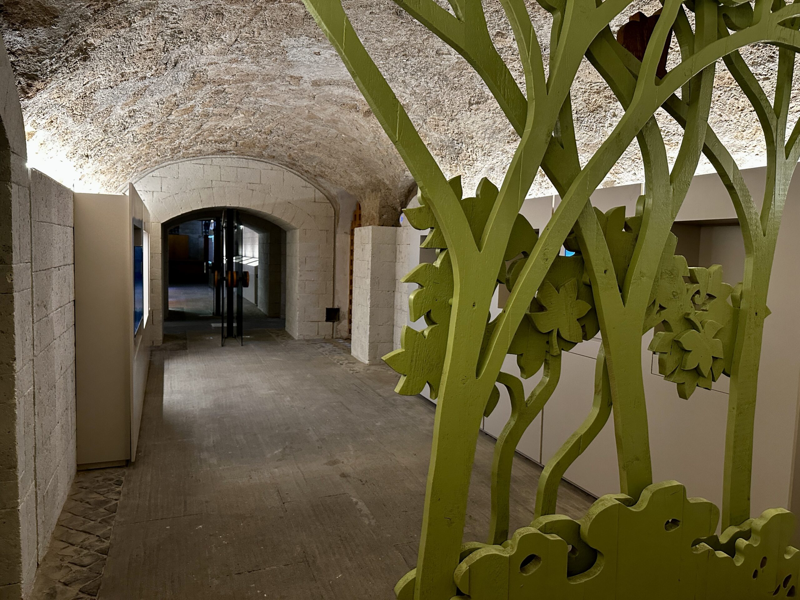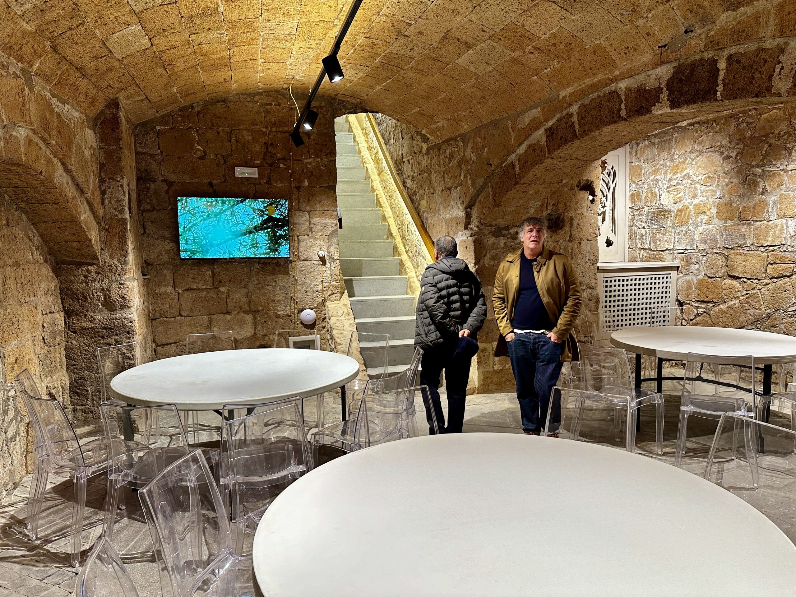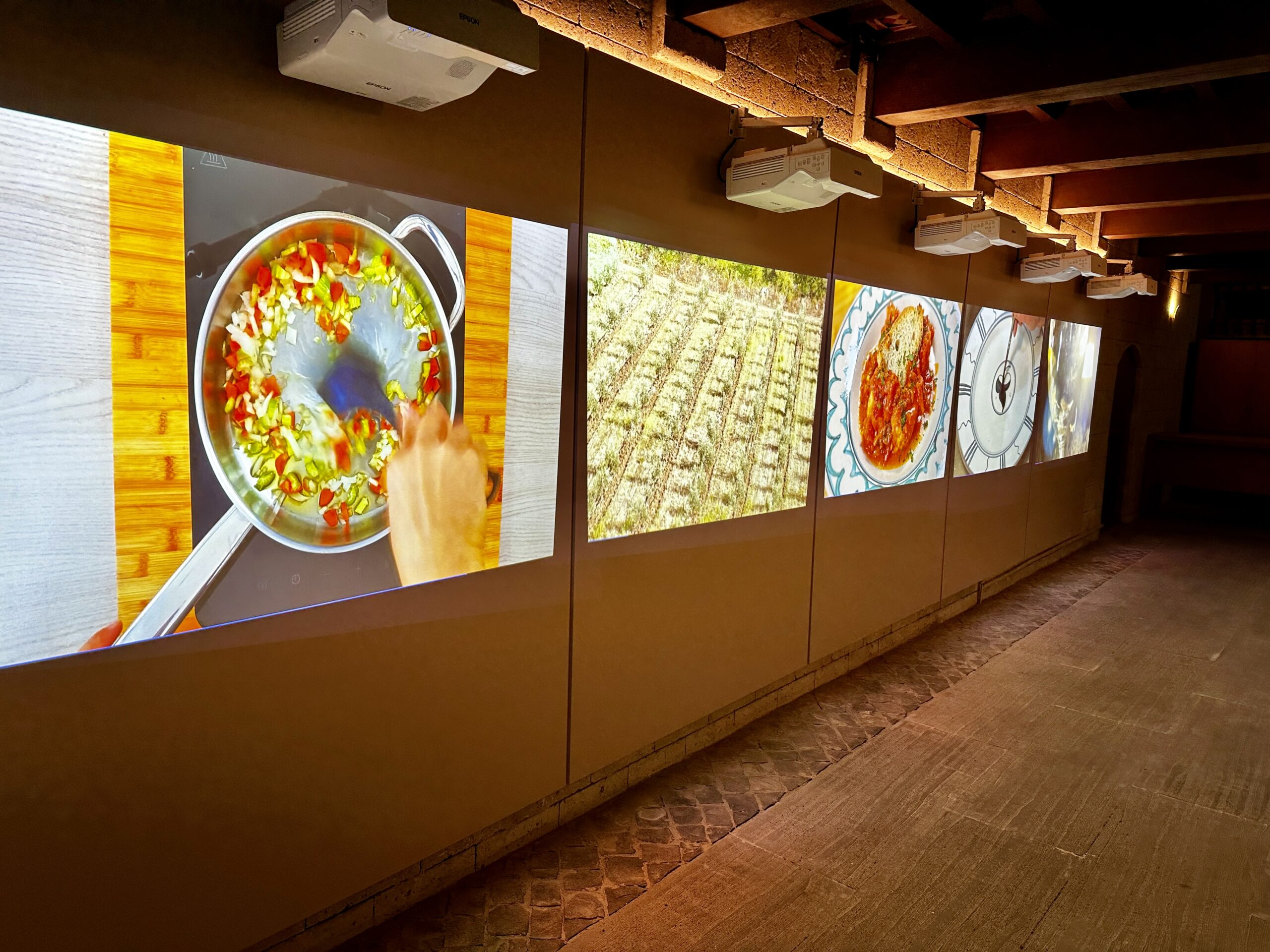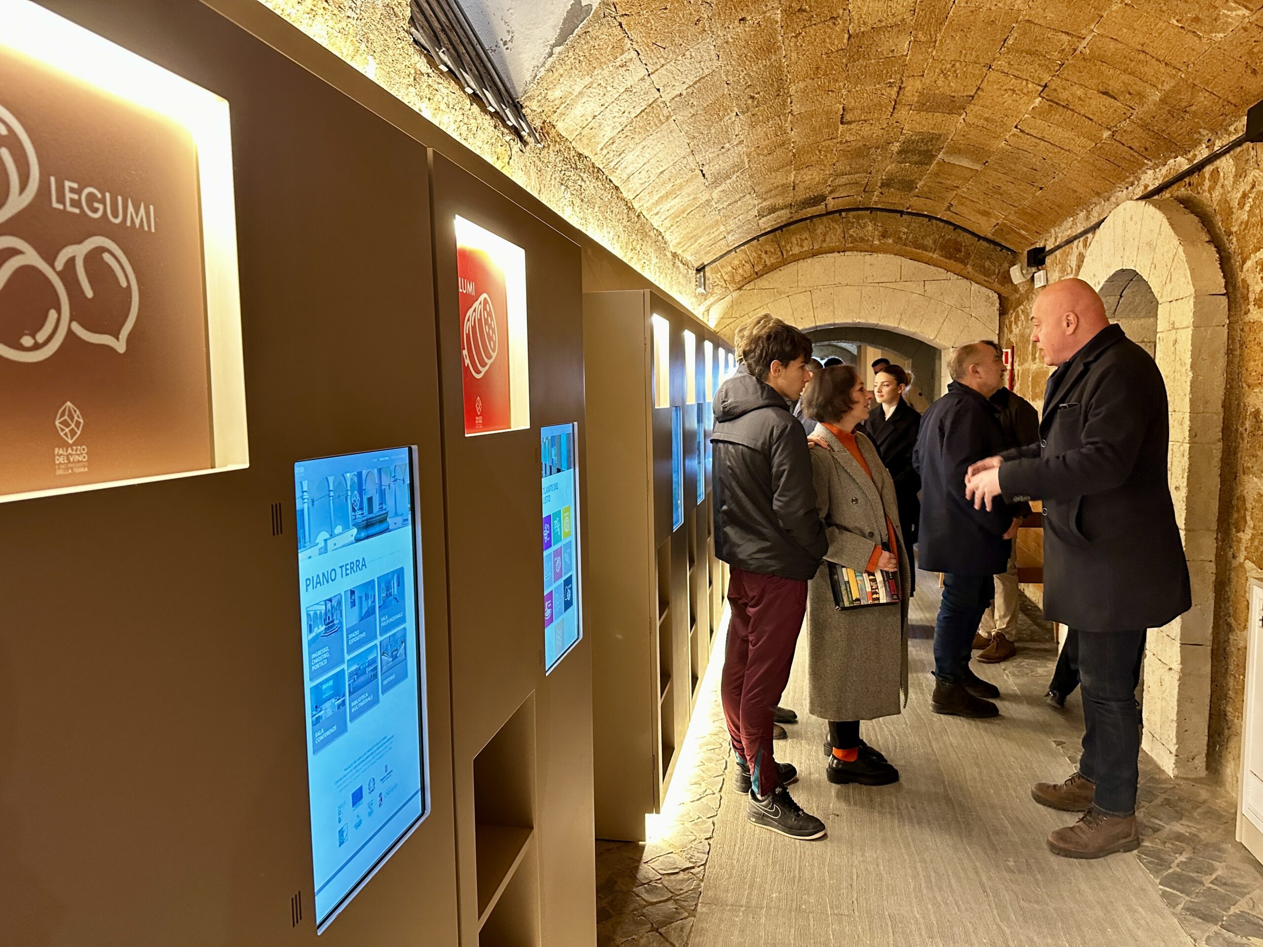 Qui si trova anche la scala che è stata recuperata e adeguata per fungere da collegamento con il piano interrato anch’esso composto da sei spazi tra corridoi e sale espositive tematiche ricche di contenuti multimediali interattivi ed immersivi e dedicate ai prodotti e alle produzioni agroalimentari ed enogastronomiche ma anche all’arte a all’artigianato.