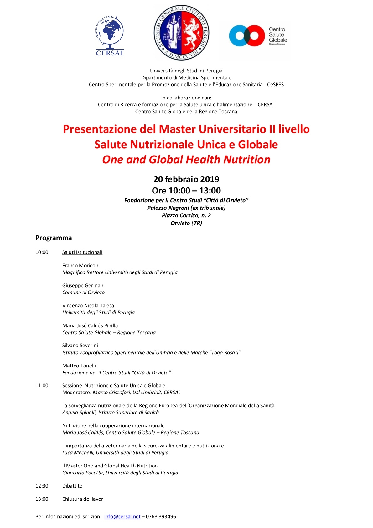 • Master Universitario di II livello “One and Global Health Nutrition” attivato dall’Università degli Studi di Perugia in collaborazione con il CERSAL di Orvieto ed il Centro Salute Globale della Regione Toscana