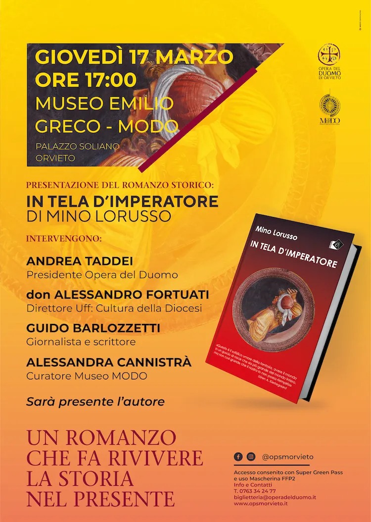 (ON/AF) – ORVIETO – Giovedì 17 Marzo alle ore 17 presso il Museo Emilio Greco verrà presentato il libro “In tela d’imperatore” del giornalista Mino Lorusso (Oltre Edizioni) romanzo storico, ambientato nell’Umbria del ‘700. Ad introdurre l’incontro sarà il presidente dell’Opera del Duomo di Orvieto, Andrea Taddei; oltre all’autore saranno presenti don Alessandro Fortunati, direttore dell’ufficio cultura della Diocesi di Orvieto-Todi, il giornalista e scrittore, Guido Barlozzetti, e il curatore del Museo dell’Opera del Duomo, Alessandra Cannistrà.
