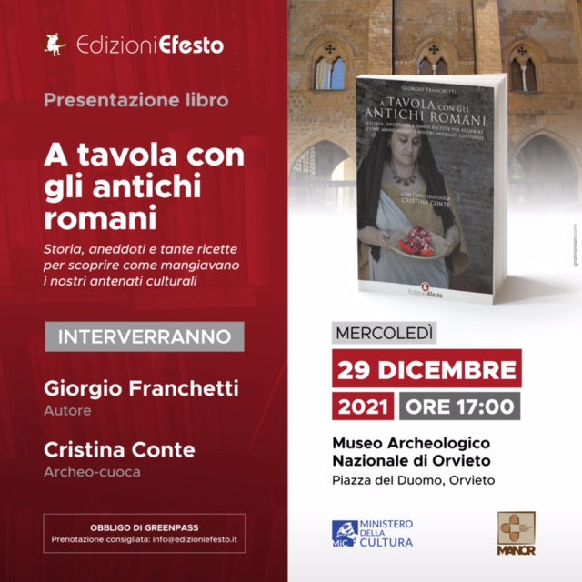 (ON/AF) – ORVIETO – L’archeologia incontra il palato Mercoledì 29 dicembre 2021 alle ore 17:00 presso il Museo Archeologico Nazionale di Orvieto, in occasione della presentazione del saggio “A TAVOLA CON GLI ANTICHI ROMANI”, del divulgatore storico Giorgio Franchetti.