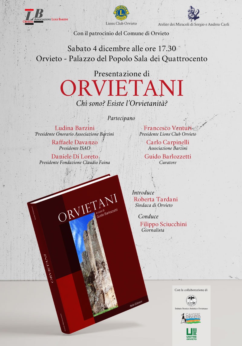 (ON/AF) – ORVIETO – Con il patrocinio del Comune, nell’ambito del programma di eventi “A Natale regalati Orvieto 2021”, Sabato 4 dicembre alle ore 17:30 presso la Sala dei Quattrocento del Palazzo del Popolo verrà presentato il volume ORVIETANI (Edizioni Itala), curato dal giornalista Guido Barlozzetti, dall’Associazione Luigi Barzini e dal Lions Club di Orvieto e dalla collaborazione di “Cantiere Orvieto”, ISAO/Istituto Storico Artistico Orvietano e Unitre Orvieto.