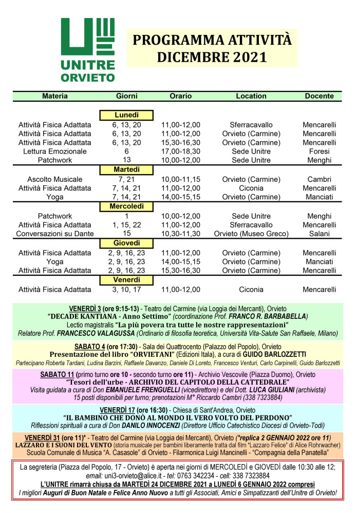 UNITRE Orvieto: Programma attività culturali di Dicembre