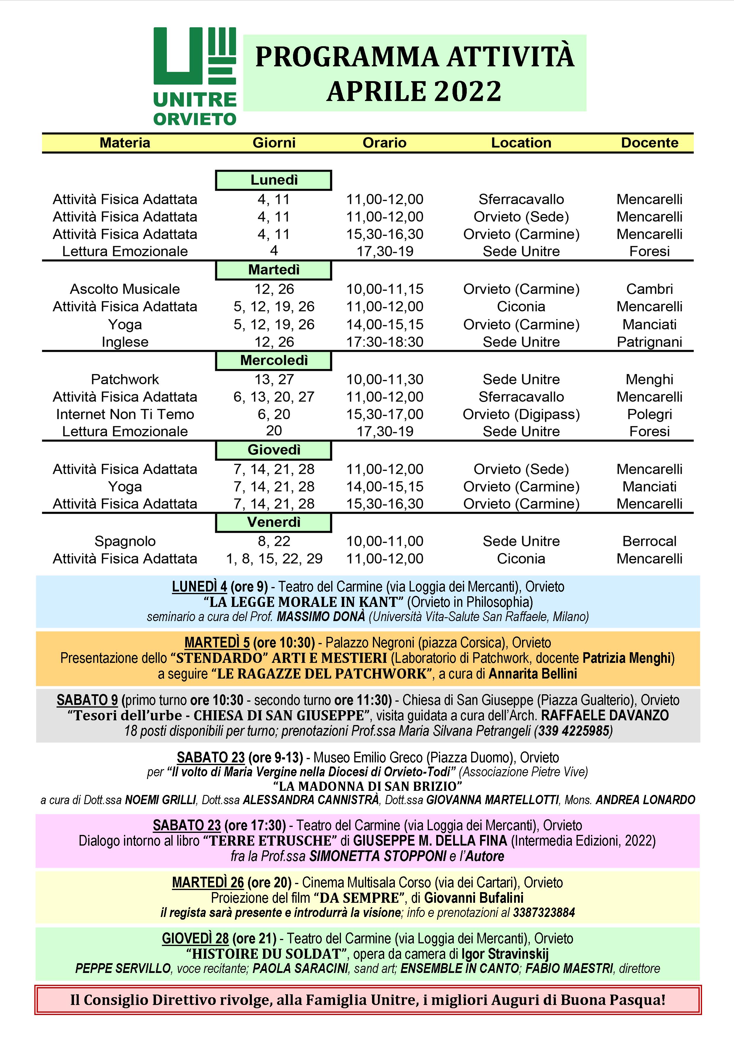 (ON/AF) – ORVIETO – L’Unitre – Università delle Tre Età di Orvieto rende noto il calendario delle attività didattiche e culturali del mese di Aprile 2022 caratterizzato dalla regolare prosecuzioni dei corsi e laboratori attualmente in corso di svolgimento, ovvero: Attività Fisica Adattata, Lettura Emozionale, Ascolto Musicale, Yoga, Inglese, Patchwork, Internet Non Ti Temo, Spagnolo e da una serie di appuntamenti speciali.