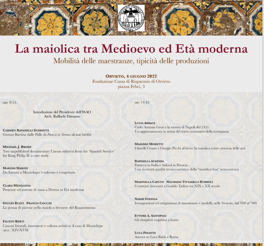 Convegno internazionale dal titolo La maiolica tra Medioevo ed Età moderna. Mobilità delle maestranze, tipicità delle produzioni. A cura dell’ISAO, sabato 4 giugno presso Auditorium Fondazione Cassa di Risparmio di Orvieto