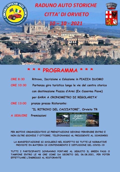 (ON/FA) – ORVIETO – Organizzato dal Circolo Epocar Alta Tuscia, Domenica 10 ottobre, si svolgerà ad Orvieto il Raduno di auto storiche che prevede il transito e la sosta per le vie e piazze del centro storico di circa 35 auto con il successivo svolgimento in Piazza d’Armi delle prove di regolarità a cronometro.