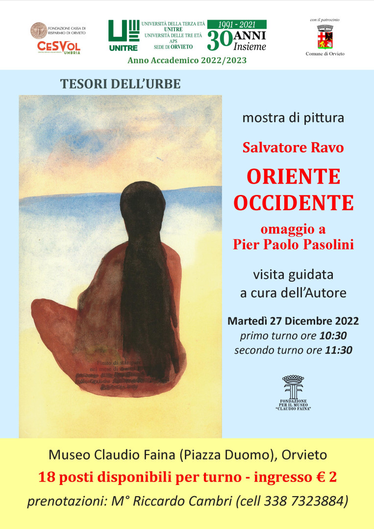 Rassegna “Tesori dell’Urbe” curata da UNITRE Orvieto propone la visita alla mostra di pittura “Oriente Occidente” omaggio a Pier Paolo Pasolini del M° Salvatore Ravo. Il 27 dicembre al Museo “Claudio Faina”