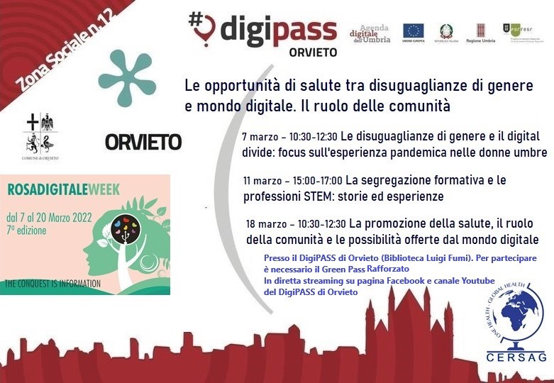 “Le opportunità di salute tra disuguaglianze di genere e mondo digitale. Il ruolo delle comunità” è il tema unificante dei tre incontri pubblici organizzati dal Digipass gestito dalla Fondazione per il Centro Studi Città di Orvieto e dal CERSAG – Centro Regionale per la Salute Globale. L’iniziativa è inserita nel programma di eventi appositamente promossi dalla Rete dei Digipass dell’Umbria per “Rosadigitale Week #2022”.