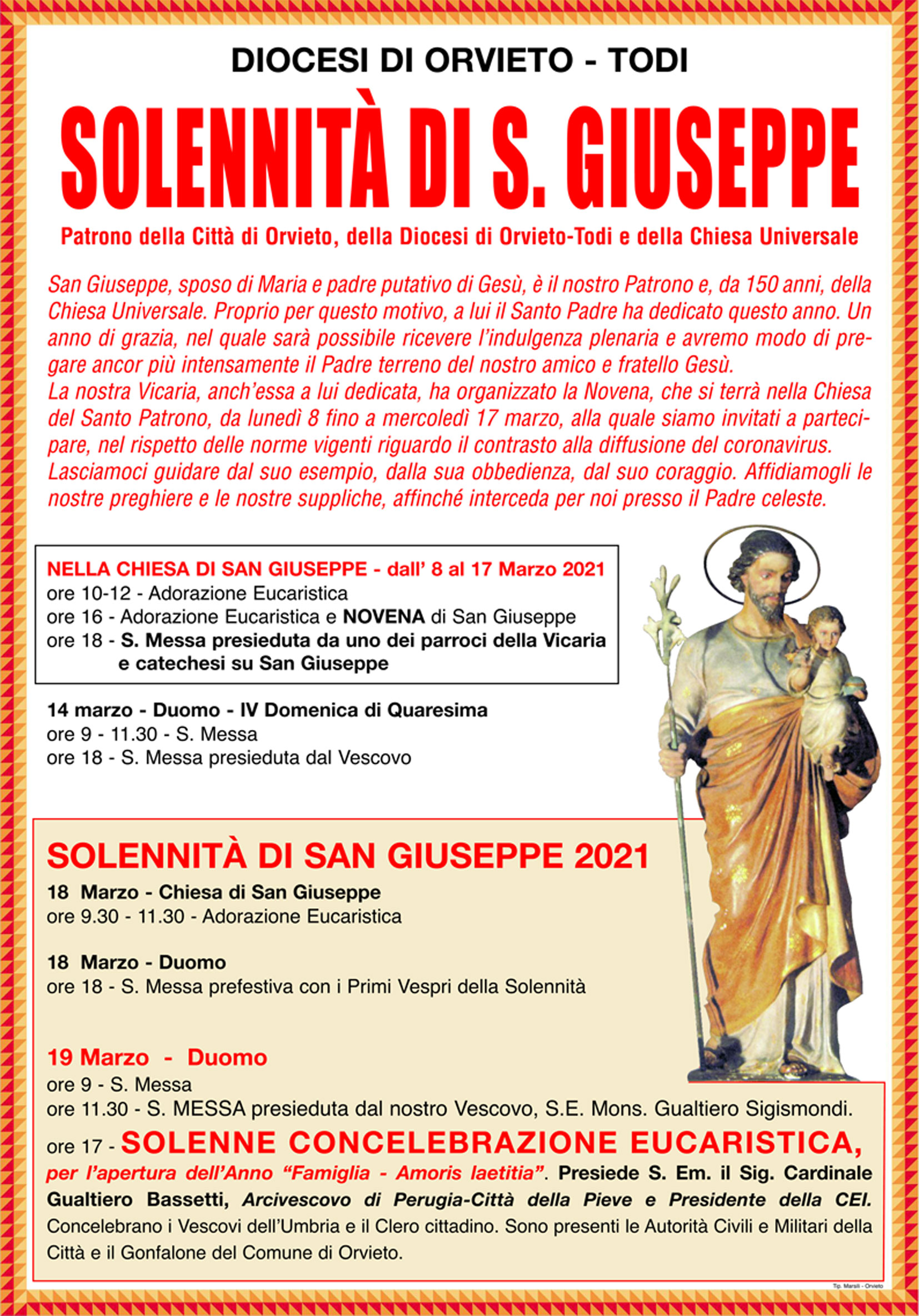 La Messa in onore del principale patrono di Orvieto e della Diocesi Orvieto-Todi sarà celebrata alle ore 17:00 in Duomo. S.E. il Cardinale Gualtiero Bassetti, Arcivescovo di Perugia-Città della Pieve e Presidente della Conferenza Episcopale Italiana, presiederà la Concelebrazione eucaristica insieme a tutti i Vescovi dell’Umbria. In tale circostanza verrà inaugurato, secondo le indicazioni del Santo Padre, l’anno dedicato a San Giuseppe e alla riflessione sull’Esortazione Apostolica “Amoris laetitia” sull’amore in famiglia.