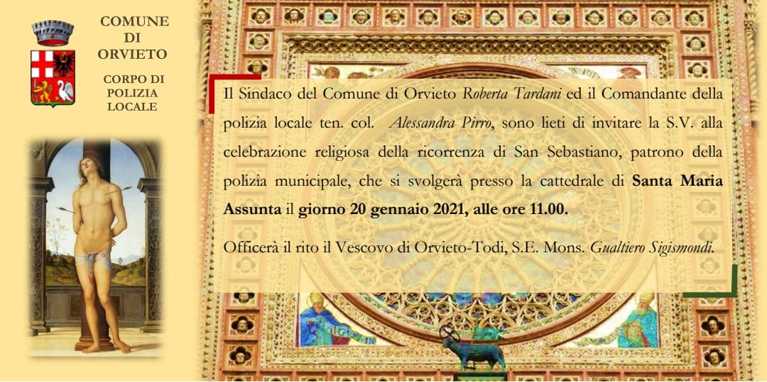 (ON/AF) – ORVIETO – Alla vigilia della celebrazione di San Sebastiano, Patrono del Corpo dei Vigili Urbani, la Polizia Locale di Orvieto farà il bilancio delle attività svolte nel corso del 2021 durante la Conferenza Stampa che si terrà in modalità telematica domani, Mercoledì 19 Gennaio 2022 alle ore 12:00.