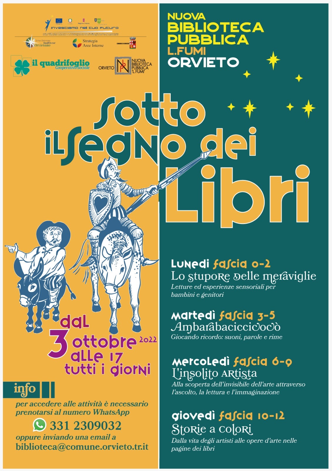 Gli incontri sono tutti gratuiti ma è obbligatoria la prenotazione inviando un messaggio al numero WhatsApp 331.2309032 oppure una mail a biblioteca@comune.orvieto.tr.it