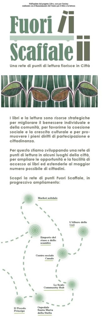 1) “Fuori Scaffale”: attivazione di punti di lettura stabili sul territorio con convenzione tra gli Enti e i soggetti ospitanti per la gestione del punto, il prestito librario e la promozione della lettura.