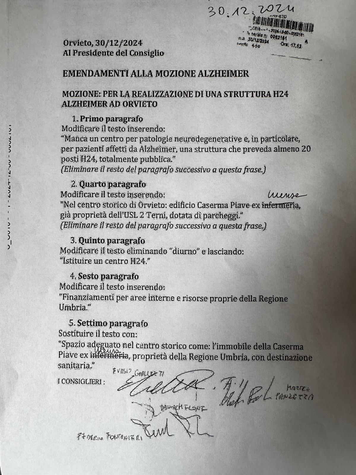 Con l’atto emendato approvato si impegna il sindaco e la giunta comunale “a istituire un centro H24 dedicato ai pazienti affetti da Alzheimer e altre malattie degenerative, con servizi specifici per le terapie psicoeducazionali e riabilitative cognitive. Reperire le risorse economiche necessarie, facendo ricorso a strumenti come i finanziamenti delle Aree Interne e fondi propri della Regione Umbria, considerando che l’orvietano è uno dei territori umbri con la più alta percentuale di anziani, particolarmente esposti al rischio di patologie neurodegenerative. Identificare uno spazio adeguato nel centro storico, come l’immobile della caserma Piave ex mensa, di proprietà della Asa Umbria 2 con destinazione sanitaria, per ospitare il centro, contribuendo al recupero e alla valorizzazione di un immobile attualmente inutilizzato e al miglioramento complessivo dei servizi alla persona. Tale iniziativa rappresenterebbe una risposta concreta e necessaria alle esigenze della comunità, offrendo una maggiore tutela ai pazienti e un sostegno significativo ai loro familiari”.