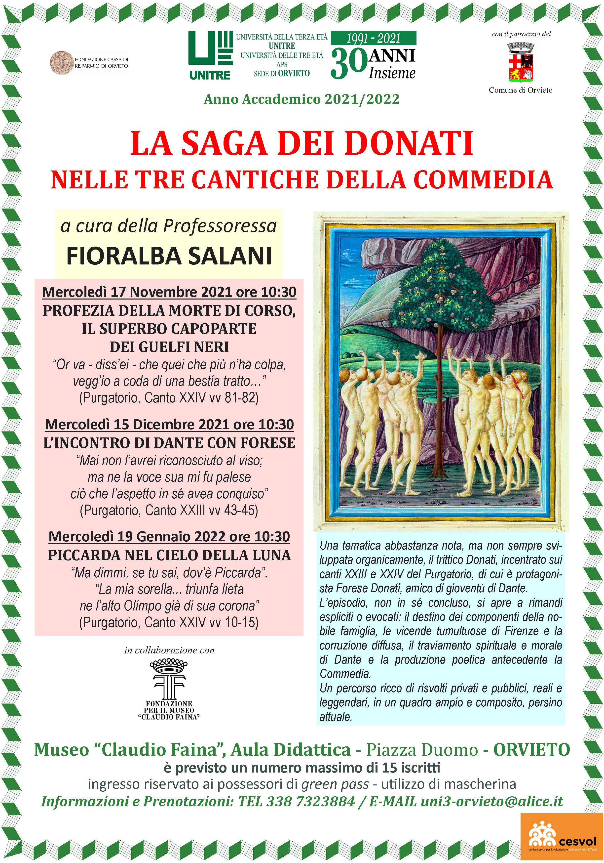 Si tratta del ciclo di tre lezioni intitolato “La saga dei Donati nelle tre cantiche della commedia” a cura della Prof.ssa Fioralba Salani che si svolgeranno di mercoledì mattina a partire dal 17 novembre, alle ore 10:30 presso l’Aula Didattica del Museo “Claudio Faina” di Orvieto.