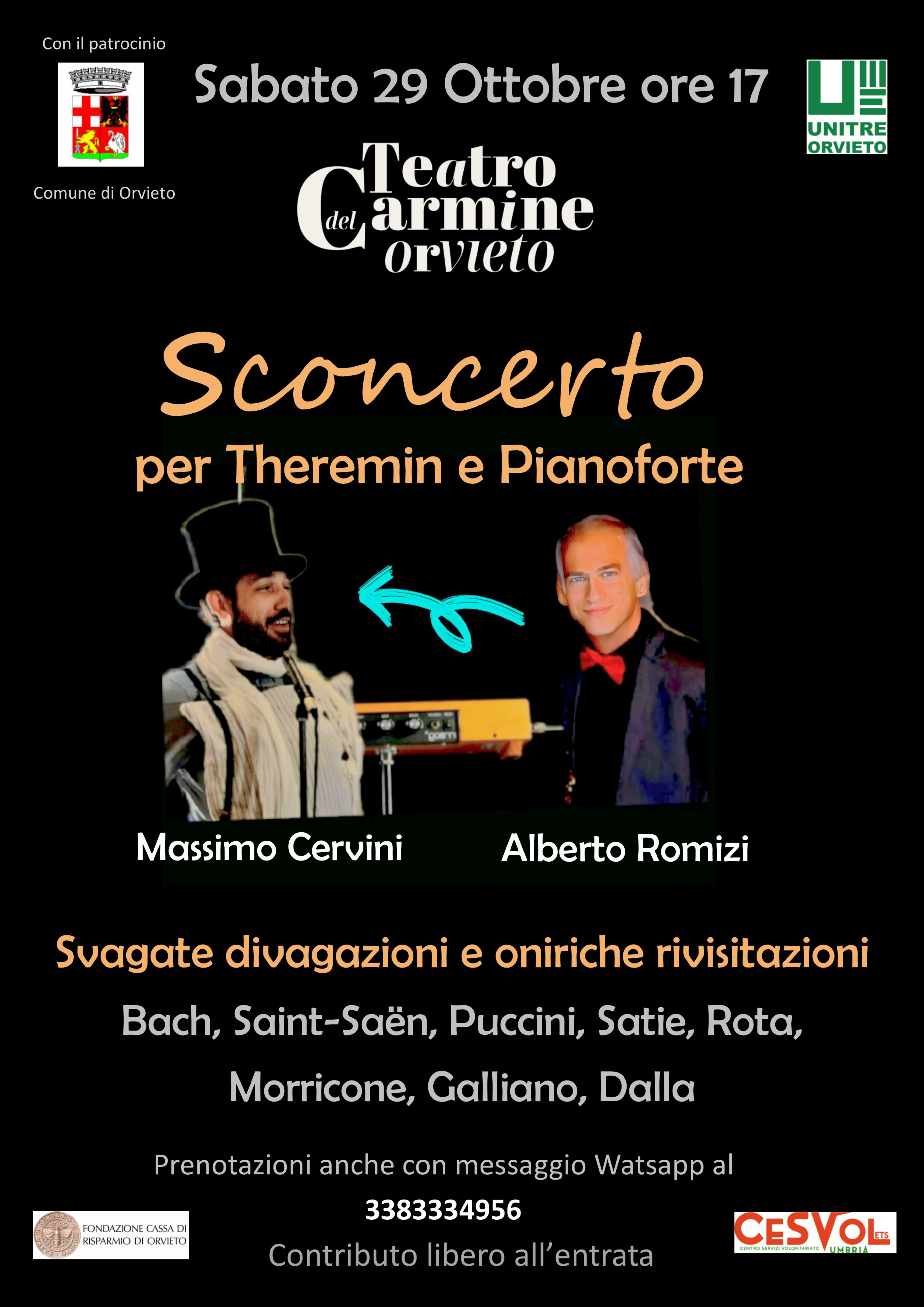 (ON/AF) – ORVIETO – Per iniziativa di Unitre Unitre Orvieto, Sabato 29 Ottobre alle ore 17 al Teatro del Carmine si terrà l’appuntamento “SCONCERTO per Theremin e Pianoforte”.