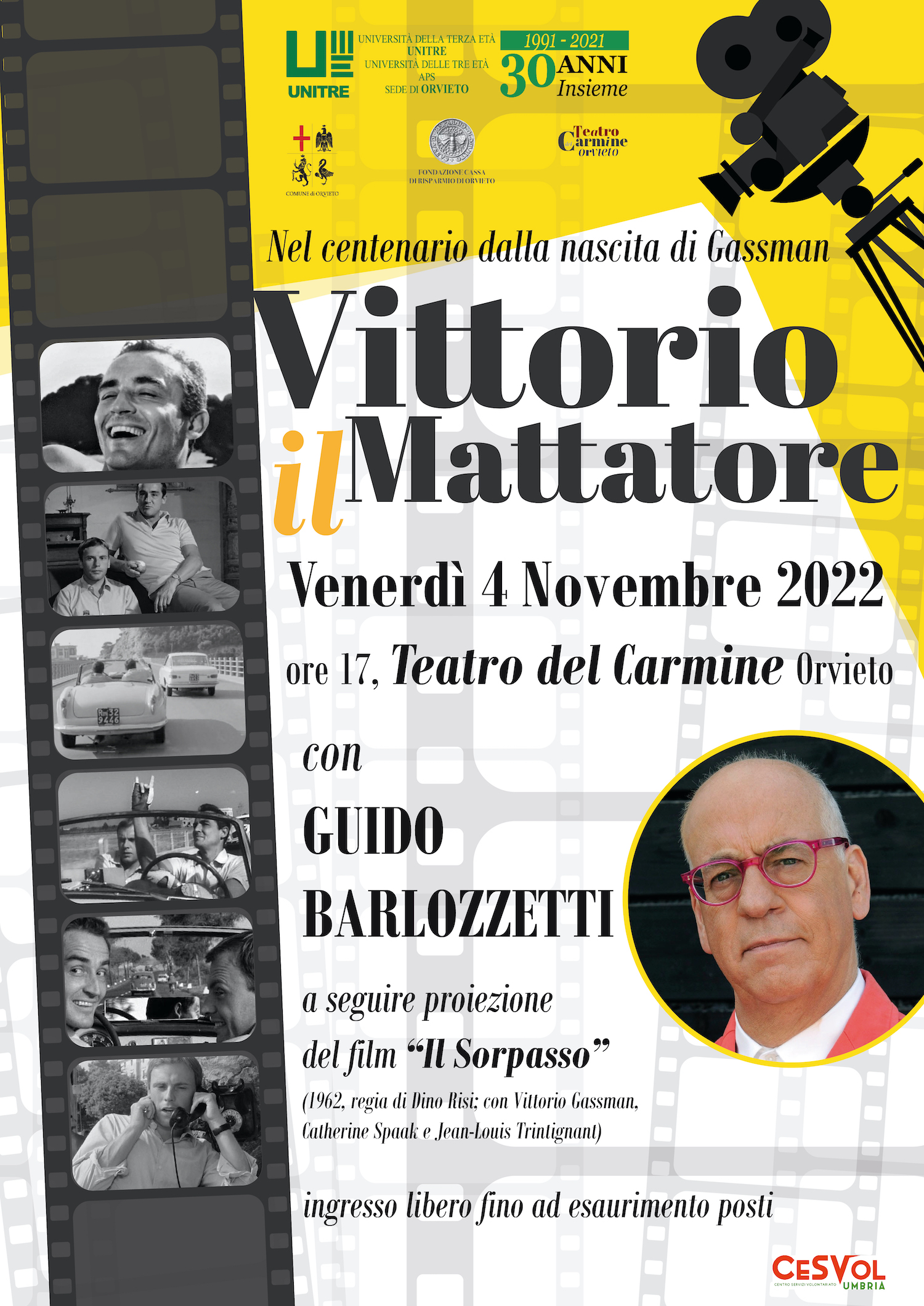 Unitre Orvieto ricorda Vittorio Gassman con l’incontro “VITTORIO, IL MATTATORE” a cura di Guido Barlozzetti – Venerdì 4 Novembre h 17 al Teatro del Carmine