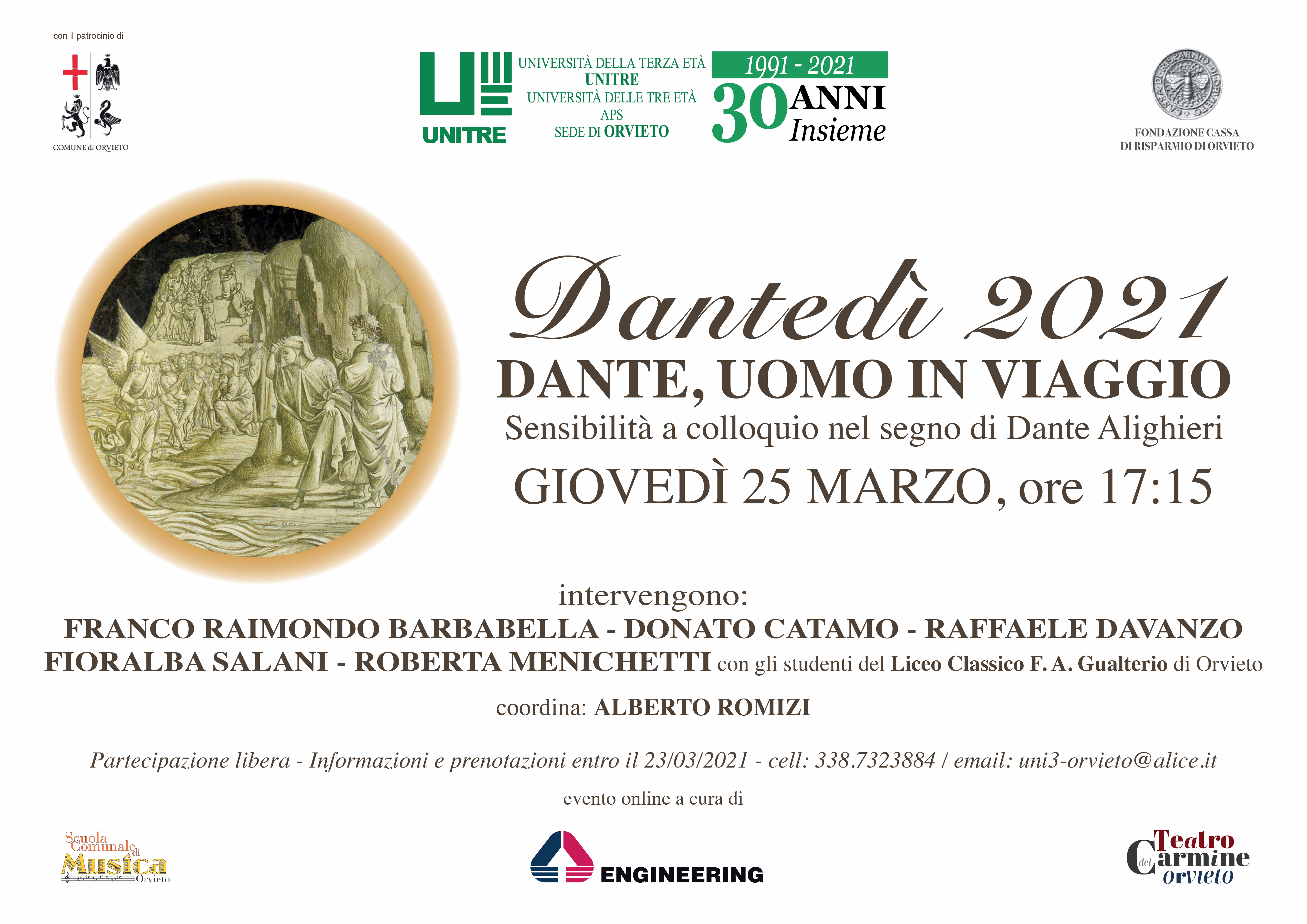 L’evento, della durata di circa 100 minuti, ideato ed organizzato dal Presidente M° Riccardo Cambri nell’ambito della programmazione dell’Unitre dedicata al Dantedì si è svolto su piattaforma digitale Zoom, con modalità di accesso tramite link internet inviato previa richiesta degli interessati.